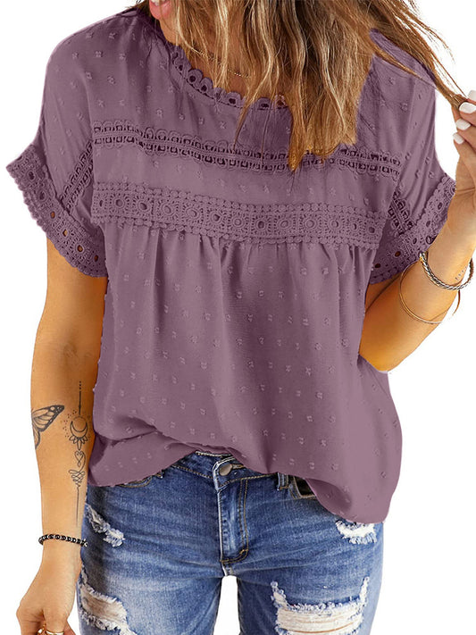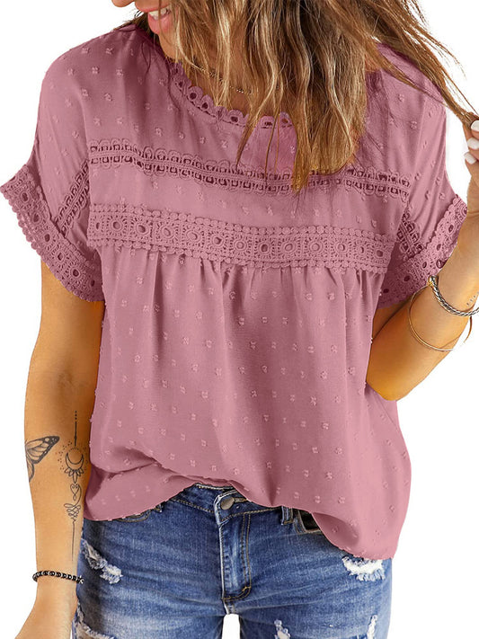 UVN Summer Womens Blouse Shirts Crewneck Lace Crochet Tops Short Sleeve Shirts Casual Chiffon Blouses