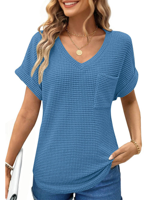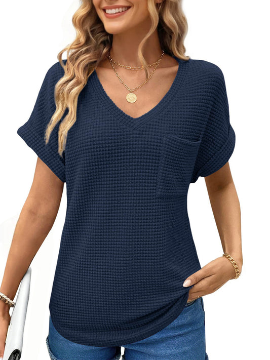 UVN Womens Summer Tops Short Sleeve V Neck Blouses Ladies Casual Waffle Knit Trendy Tunic Shirts