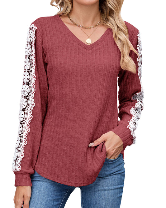 UVN Long Sleeve Shirts for Women Fall V Neck Lace Blouses Casual Dressy Tunic Pullover Sweaters Tops