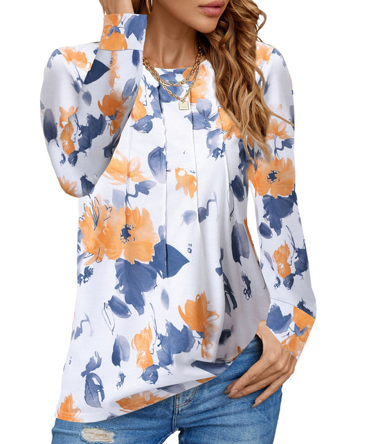 UVN Blouses for Women Pleated Long Sleeve Shirts Casual Crew Neck Tunic Tops