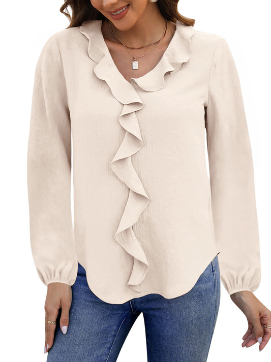 UVN Blouses for Women V Neck Long Sleeve Shirts Dressy Casual Ruffle Chiffon Tops