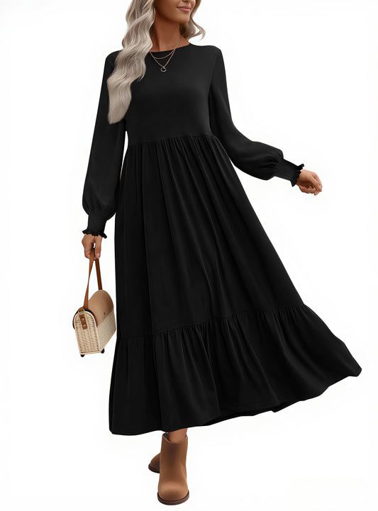 UVN Fall Long Dress for Women Crewneck Casual Long Sleeve Pleated Dresses with Pockets
