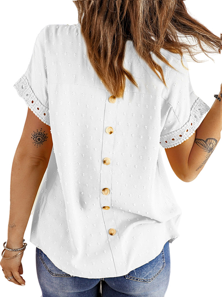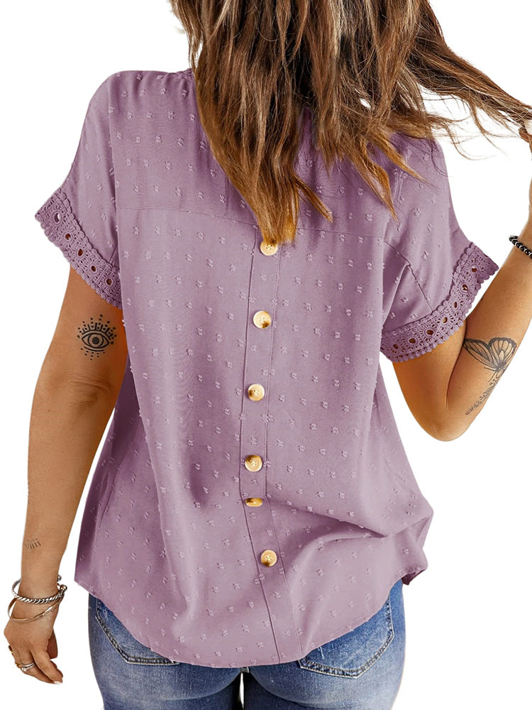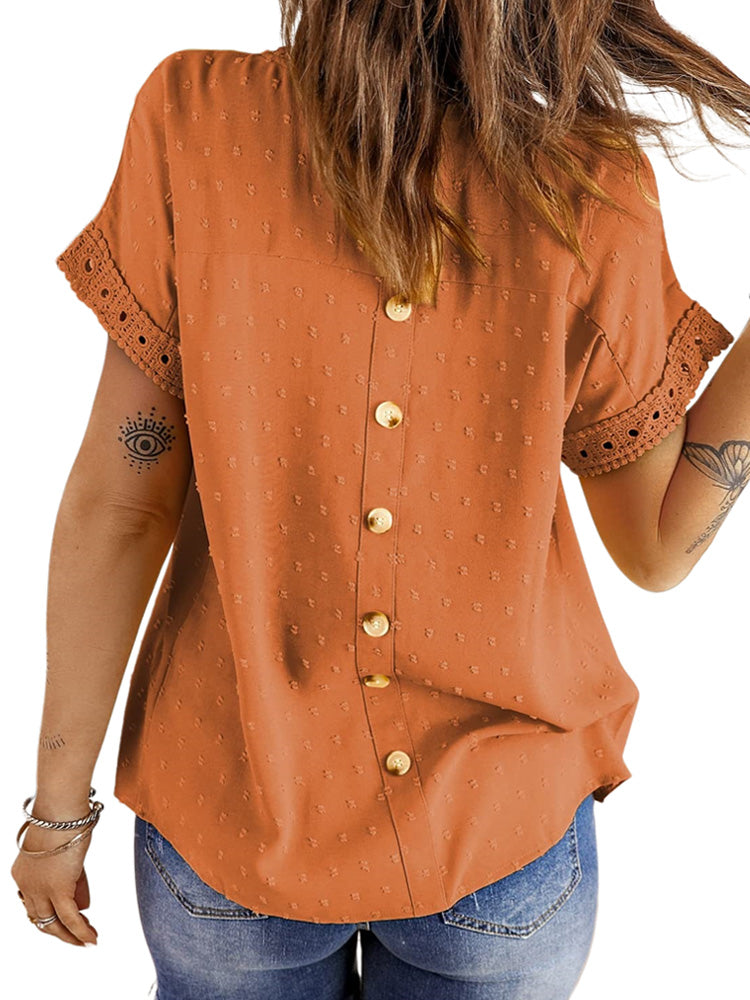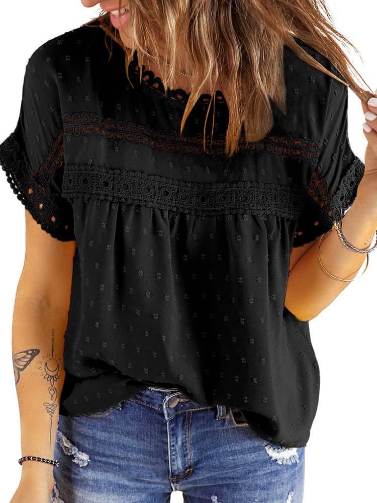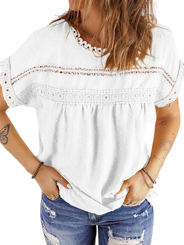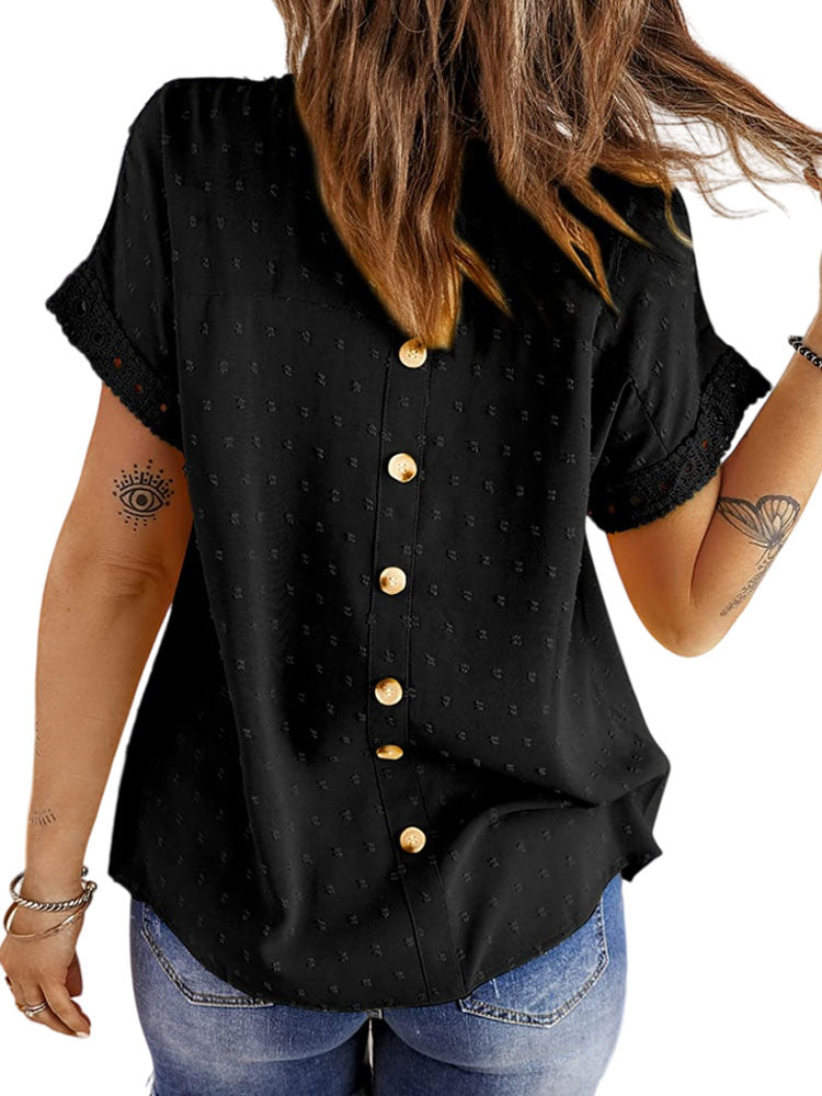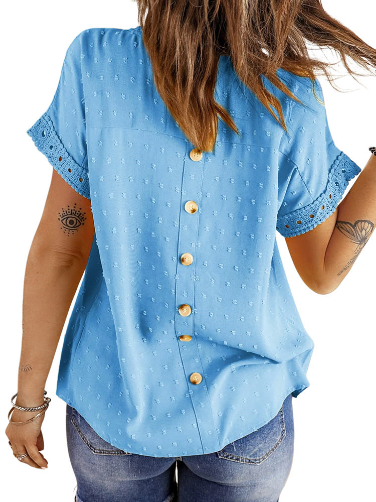 ✿【 Features 】:Delicate lace and crochet top for women details. Short sleeves for maximum comfort. Crewneck design for a casual look. Pom Swiss Dots Detailing shirt for a fancy style. Button Down Decoration womens blouse , the subtle yet stylish detail adds a touch of sophistication, making the ladies top a statement piece from every angle. Classic Round Neck Design, Elevate your everyday style with the timeless round neck silhouette.