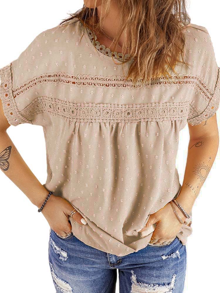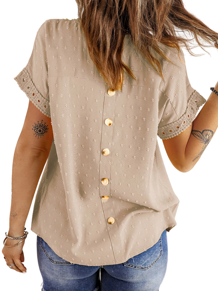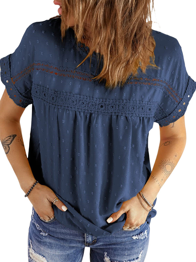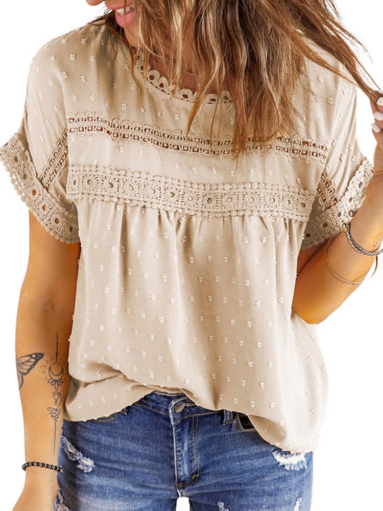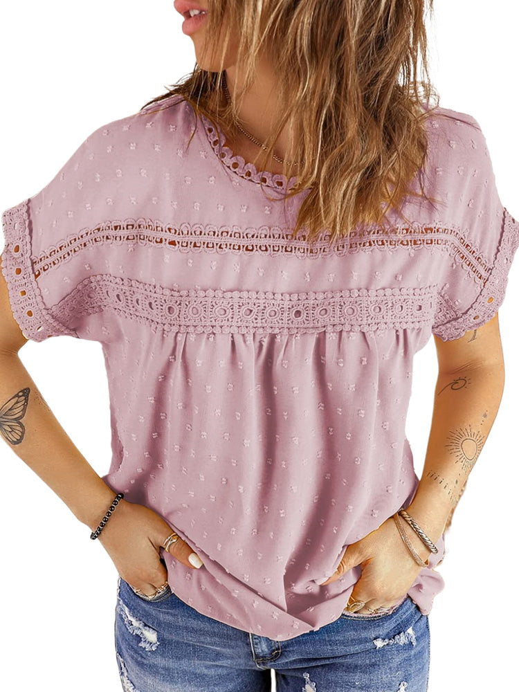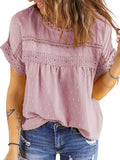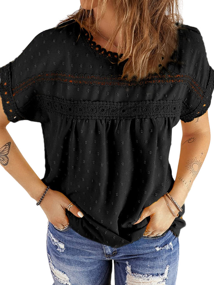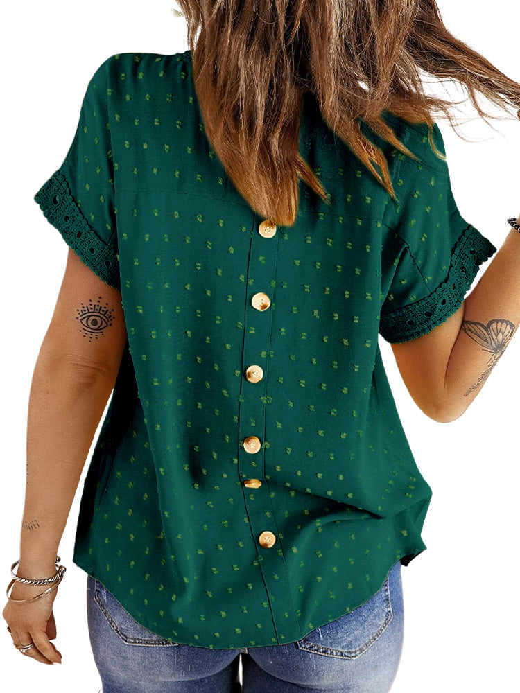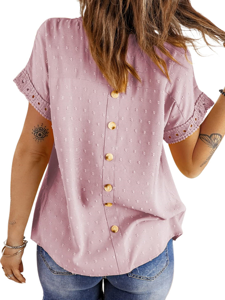 ✿【 Features 】:Delicate lace and crochet top for women details. Short sleeves for maximum comfort. Crewneck design for a casual look. Pom Swiss Dots Detailing shirt for a fancy style. Button Down Decoration womens blouse , the subtle yet stylish detail adds a touch of sophistication, making the ladies top a statement piece from every angle. Classic Round Neck Design, Elevate your everyday style with the timeless round neck silhouette.