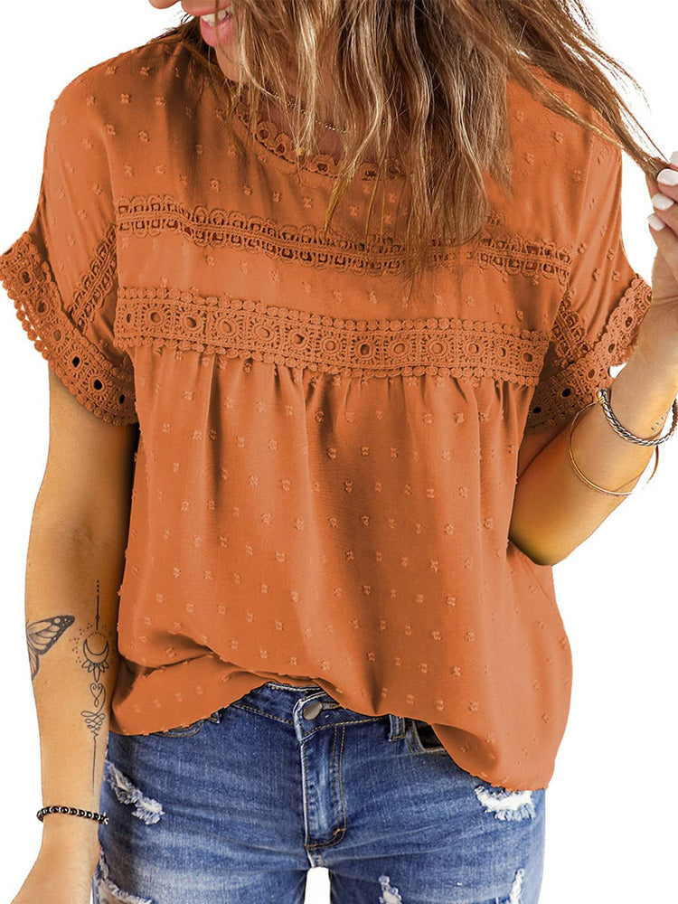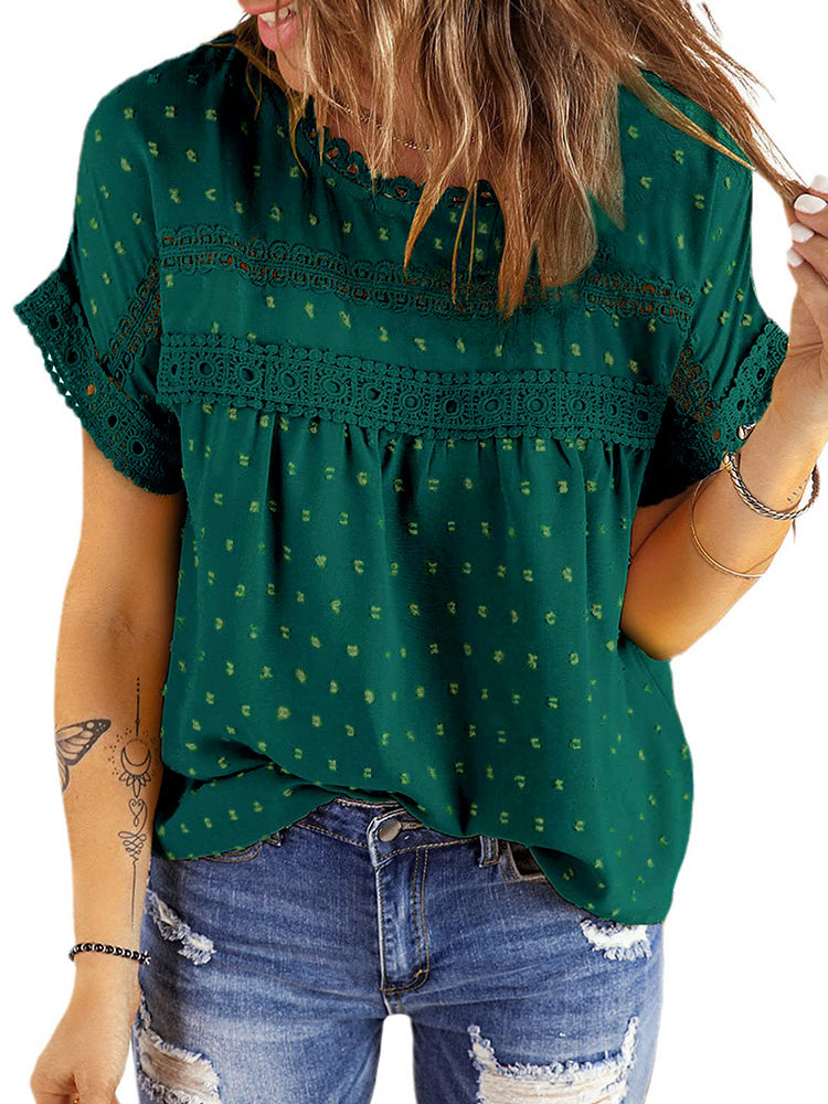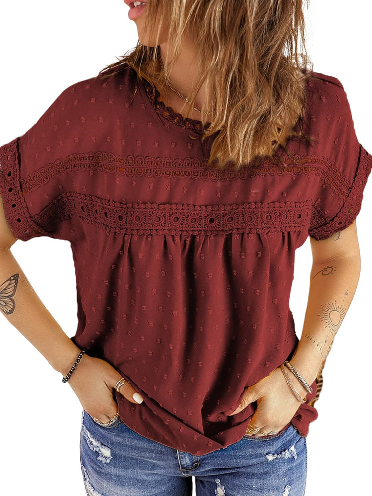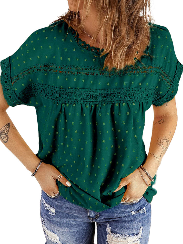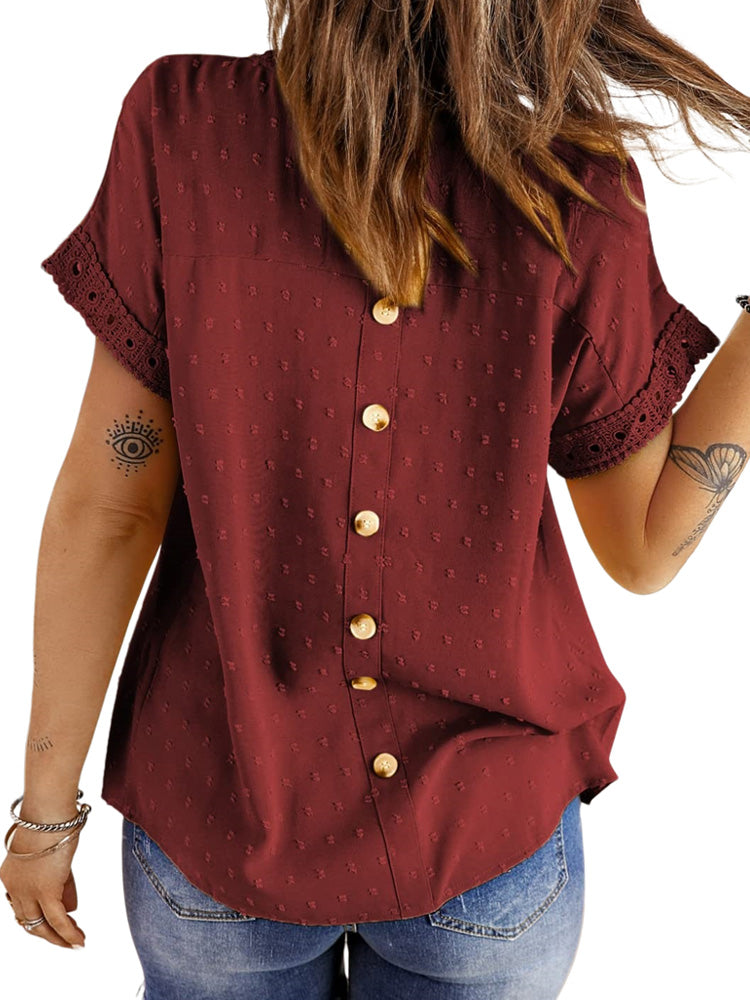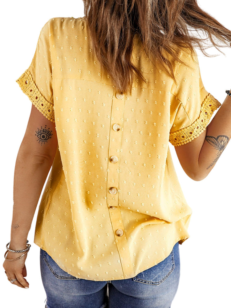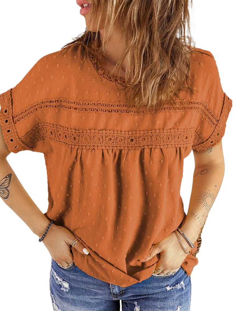 ✿【 Features 】:Delicate lace and crochet top for women details. Short sleeves for maximum comfort. Crewneck design for a casual look. Pom Swiss Dots Detailing shirt for a fancy style. Button Down Decoration womens blouse , the subtle yet stylish detail adds a touch of sophistication, making the ladies top a statement piece from every angle. Classic Round Neck Design, Elevate your everyday style with the timeless round neck silhouette.