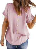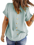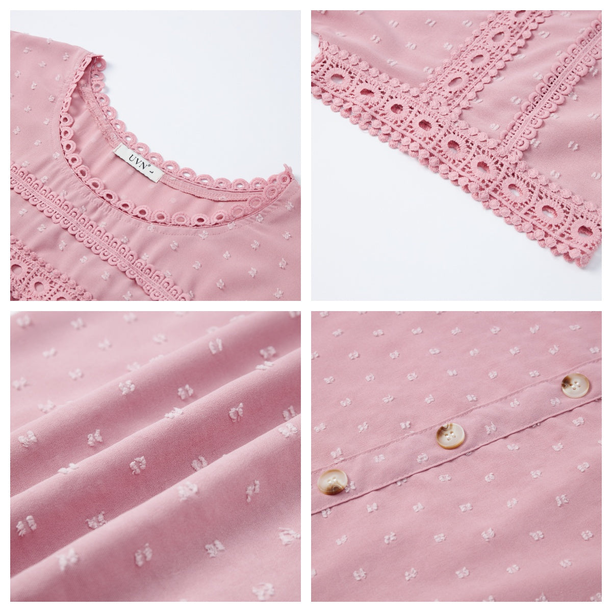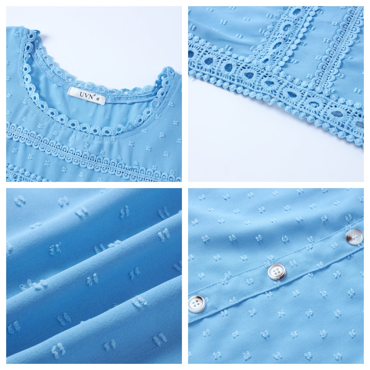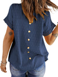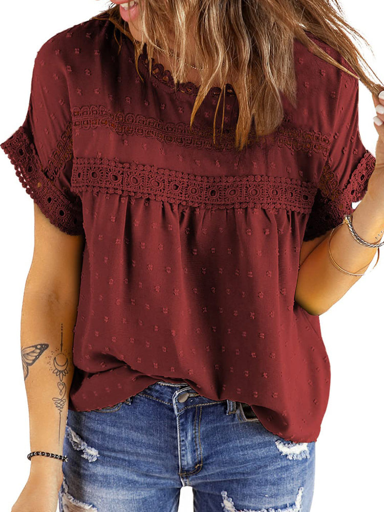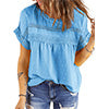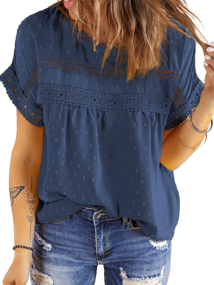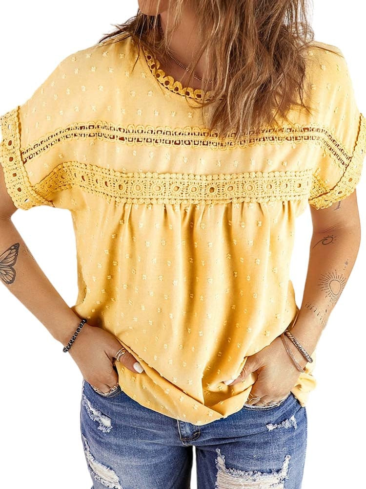 ✿【 Features 】:Delicate lace and crochet top for women details. Short sleeves for maximum comfort. Crewneck design for a casual look. Pom Swiss Dots Detailing shirt for a fancy style. Button Down Decoration womens blouse , the subtle yet stylish detail adds a touch of sophistication, making the ladies top a statement piece from every angle. Classic Round Neck Design, Elevate your everyday style with the timeless round neck silhouette.