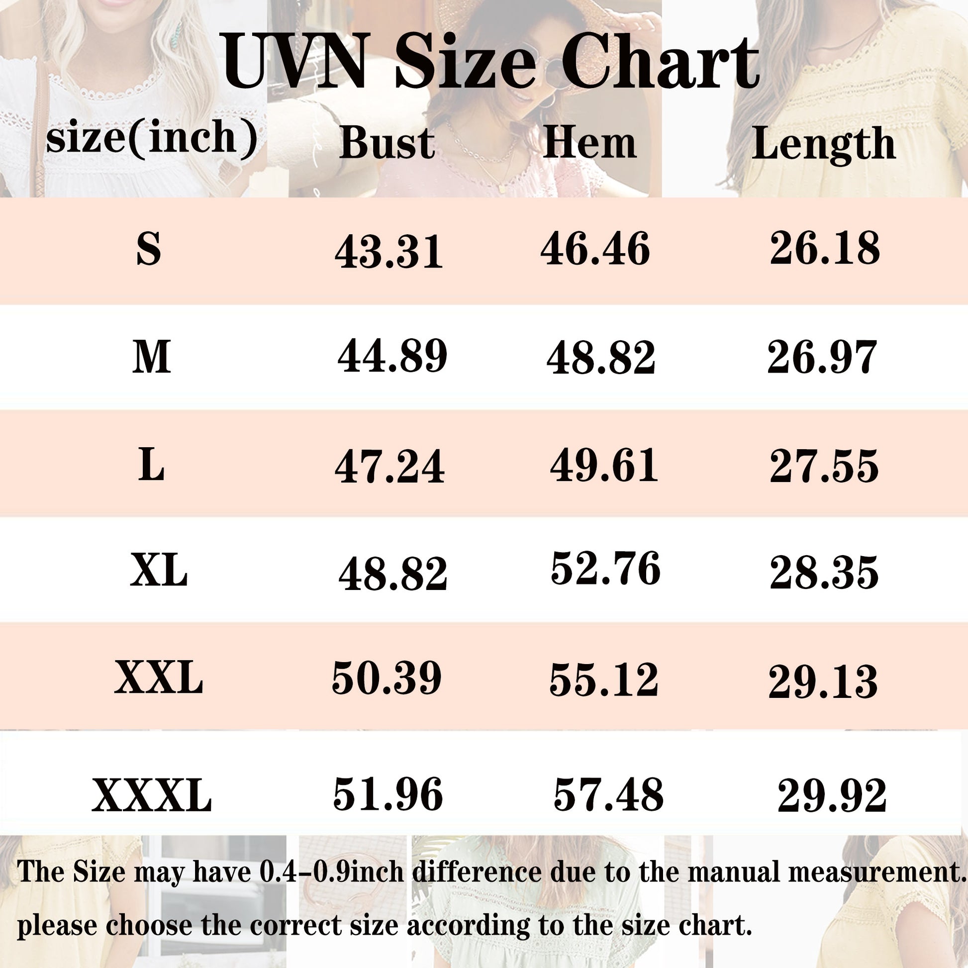 1.There may be 0.4-1.19 inch deviation in different sizes, please choose the correct size according to the size chart.