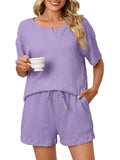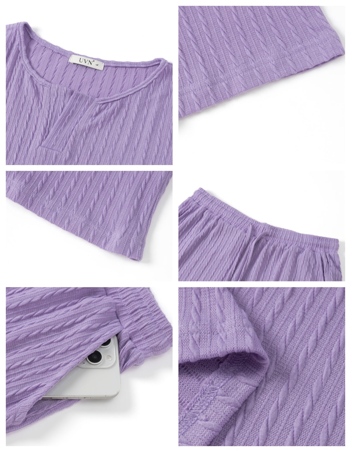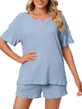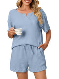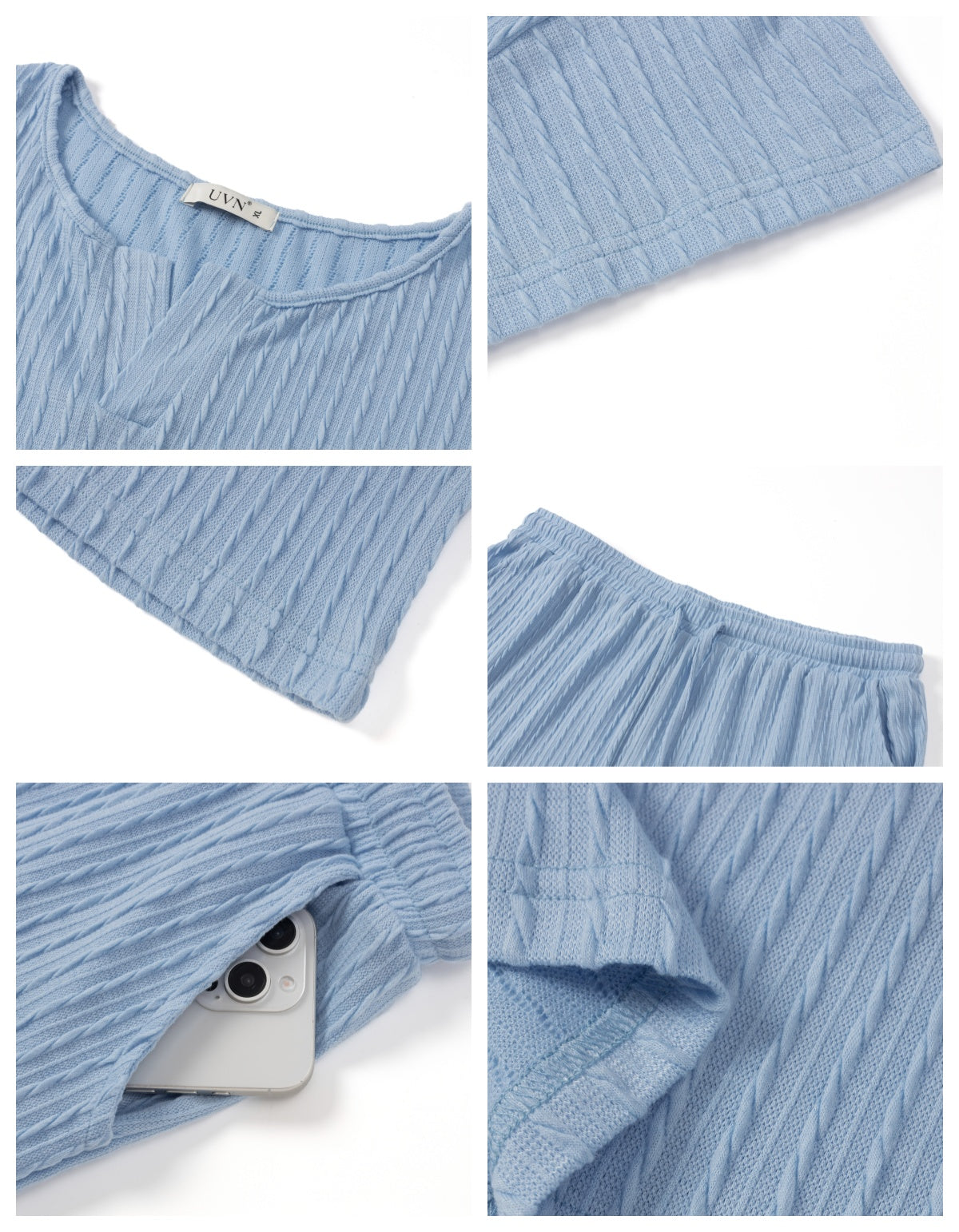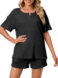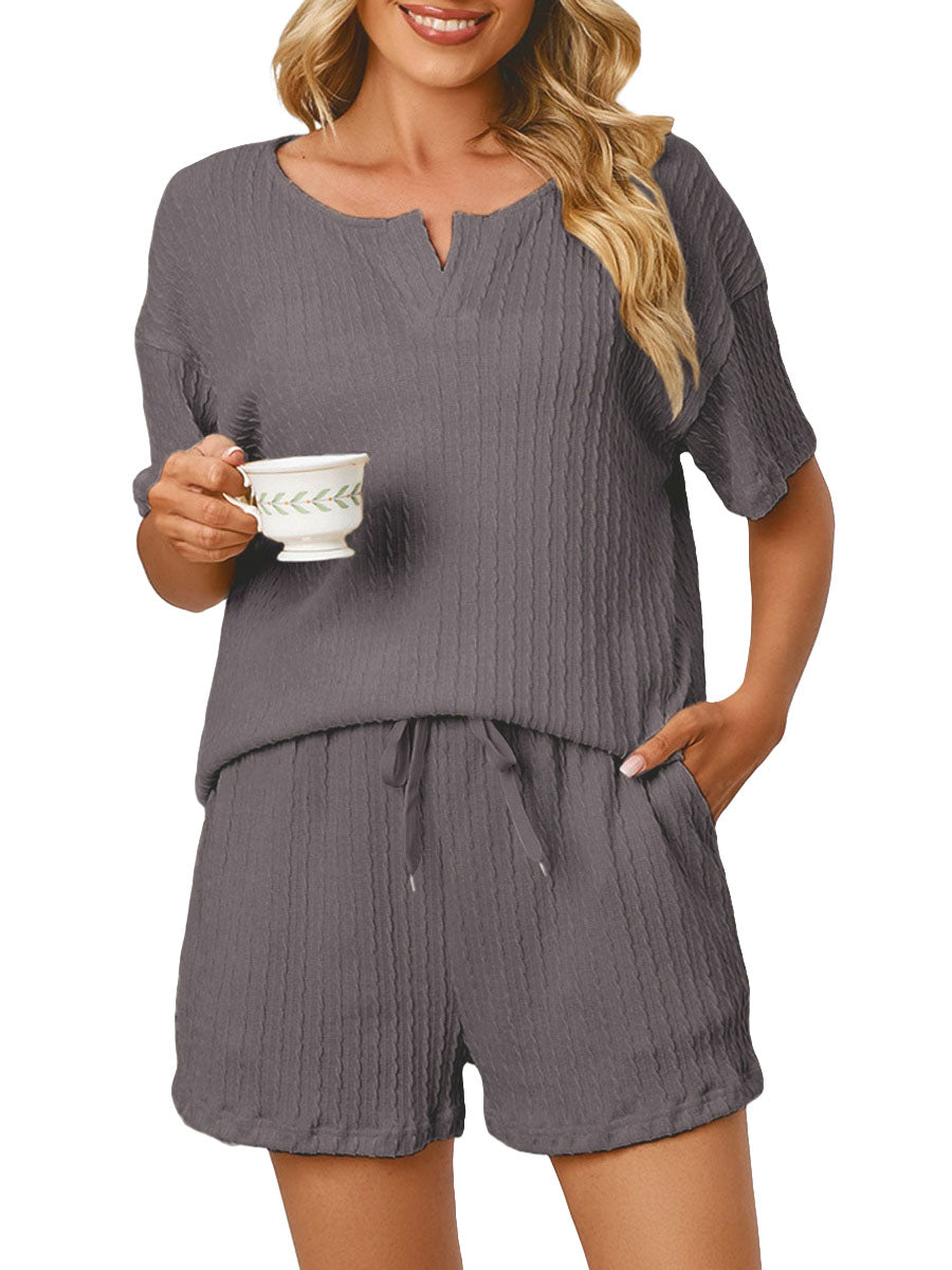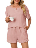 The lounge sets for women combines comfort and style with its thoughtful design and premium fabric. Made from soft, breathable materials, this ribbed sets for women features a relaxed short-sleeve drop-shoulder top paired with cozy shorts, offering ease of movement for restful sleep or casual lounging. With functional details like a drawstring waist and convenient pockets, it’s a practical yet chic addition to any wardrobe. Whether you're relaxing at home or enjoying a leisurely day, this versatile lounge set doubles as fashionable athleisure, making it perfect for staying stylishly comfortable throughout the day.