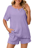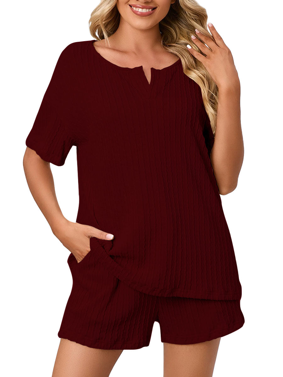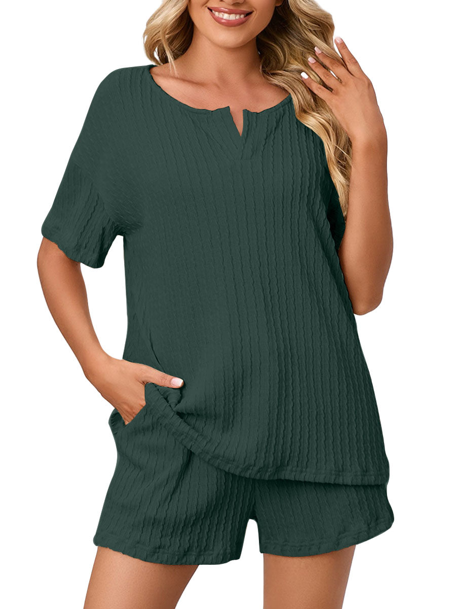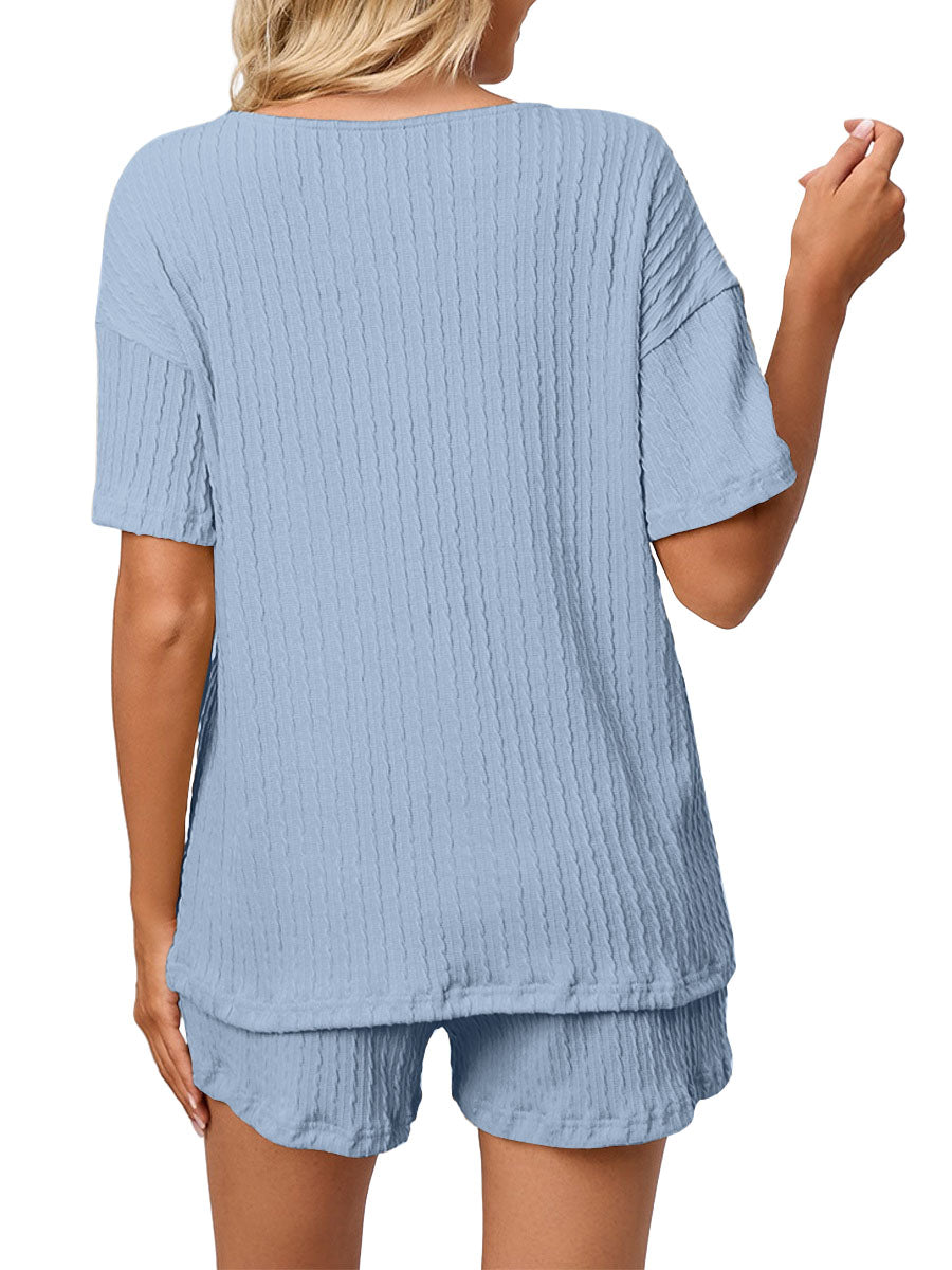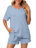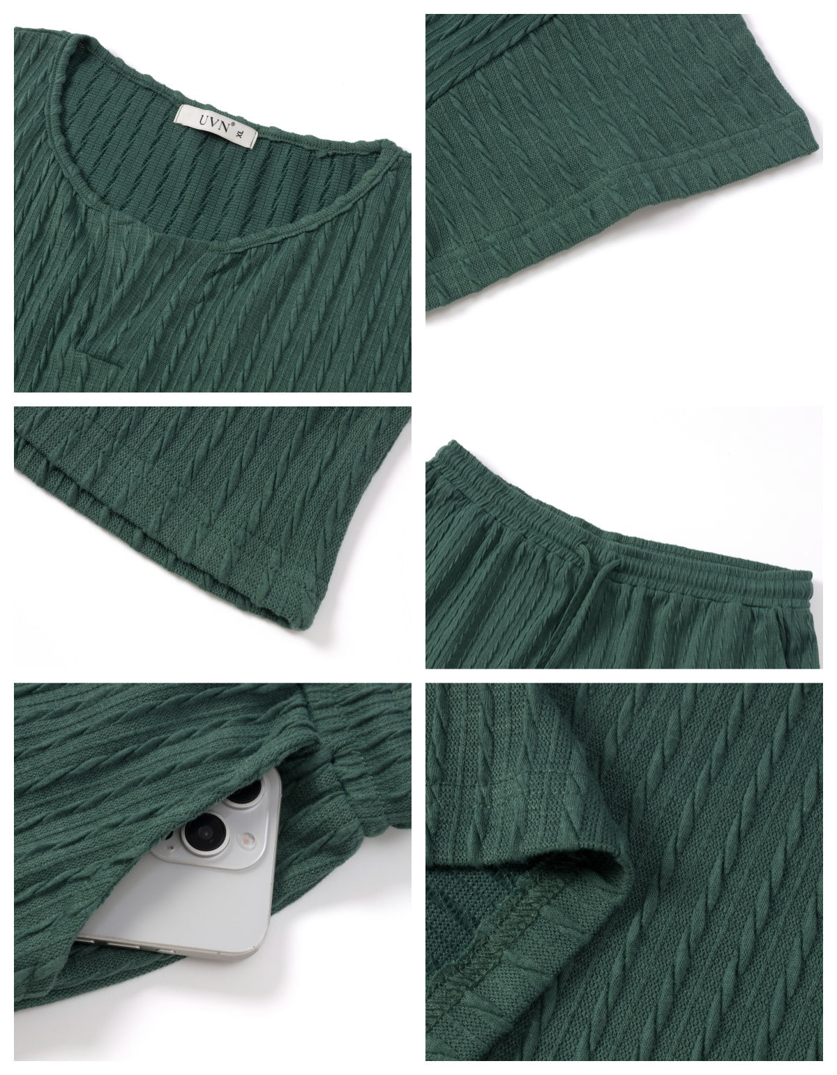 The lounge sets for women combines comfort and style with its thoughtful design and premium fabric. Made from soft, breathable materials, this ribbed sets for women features a relaxed short-sleeve drop-shoulder top paired with cozy shorts, offering ease of movement for restful sleep or casual lounging. With functional details like a drawstring waist and convenient pockets, it’s a practical yet chic addition to any wardrobe. Whether you're relaxing at home or enjoying a leisurely day, this versatile lounge set doubles as fashionable athleisure, making it perfect for staying stylishly comfortable throughout the day.