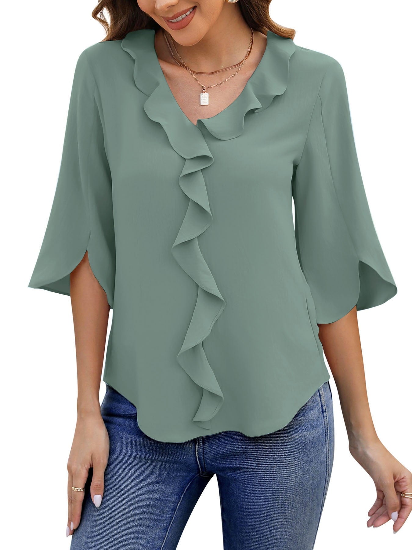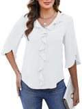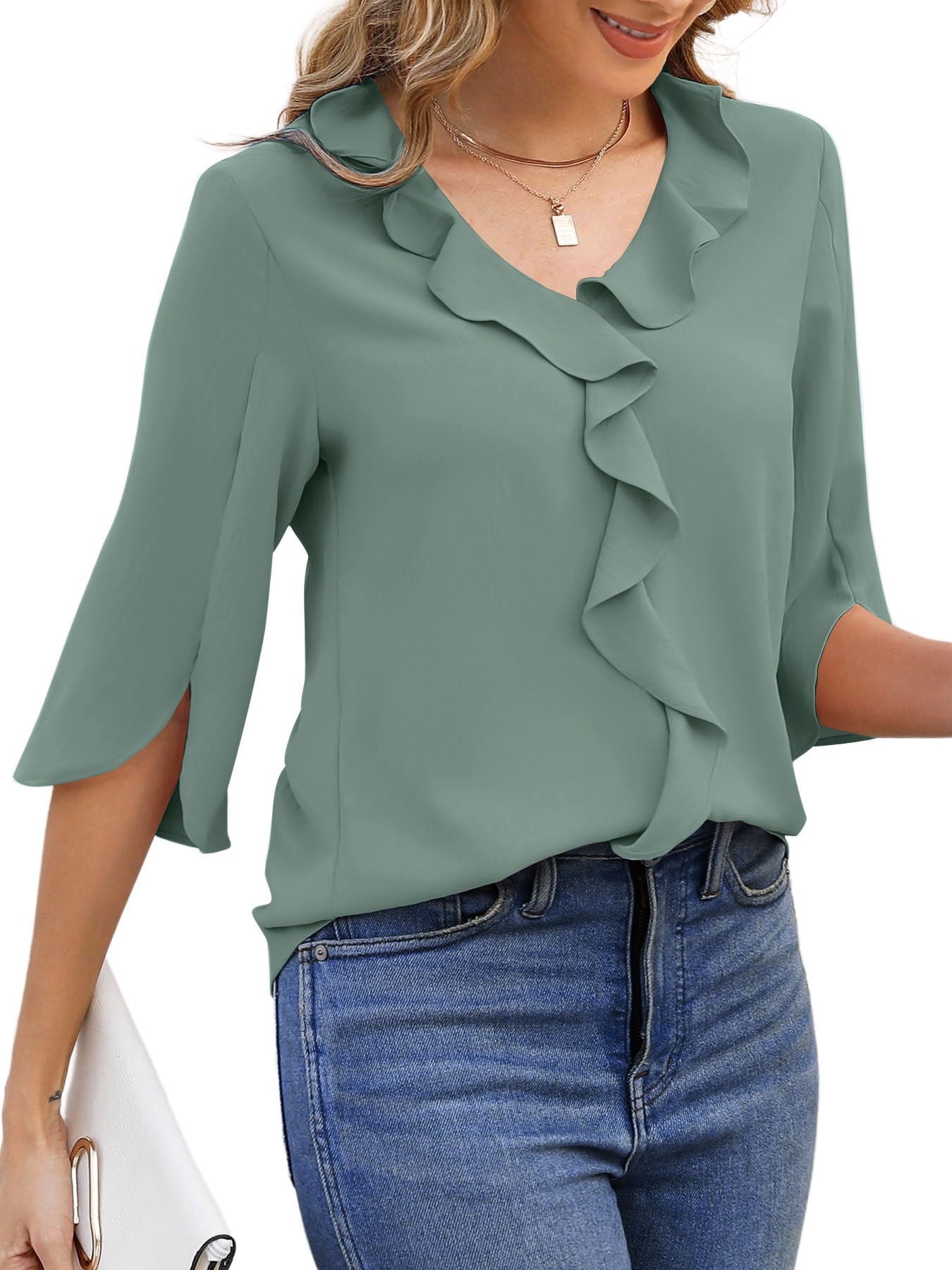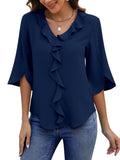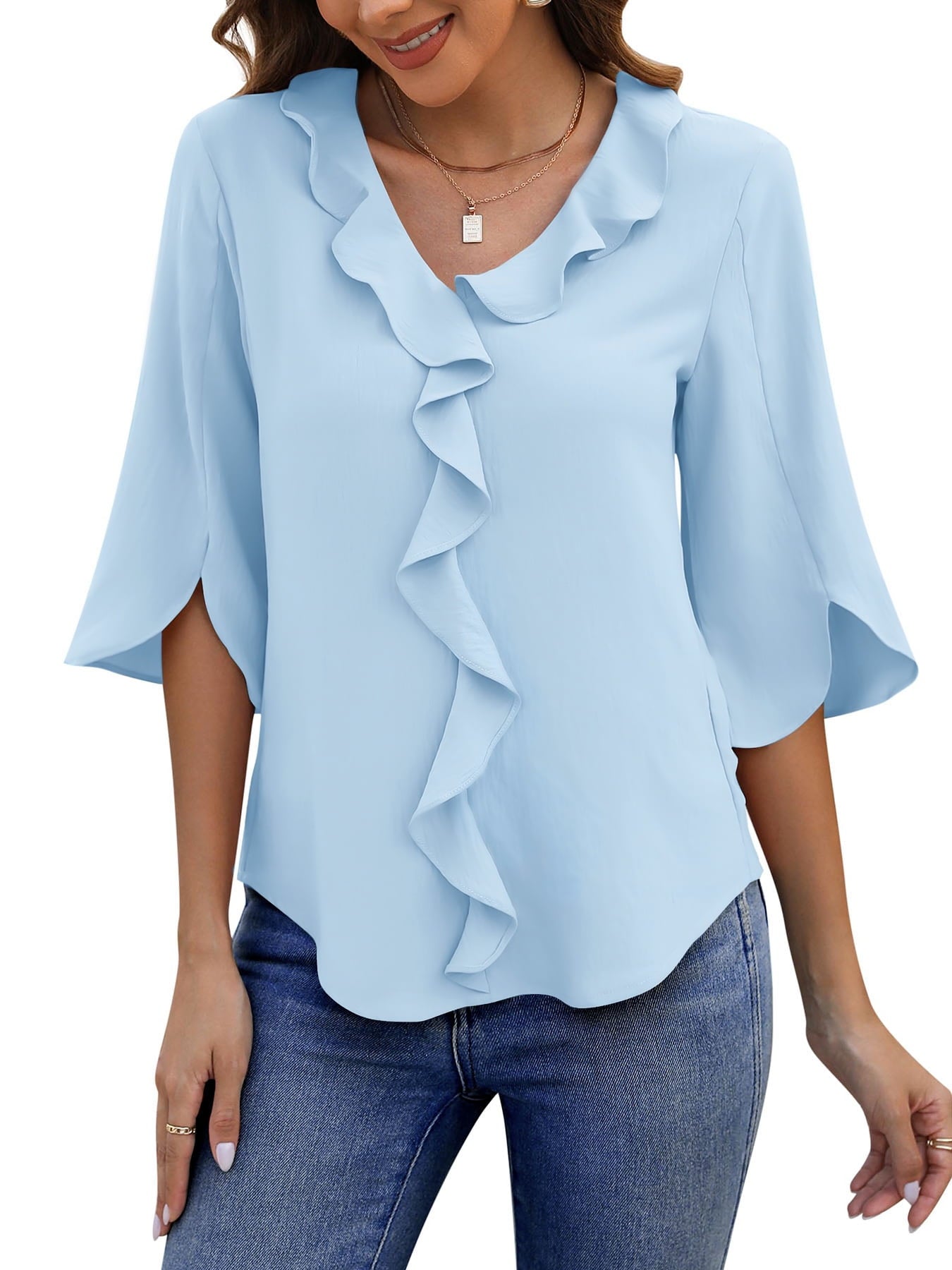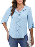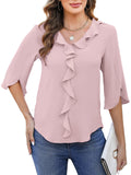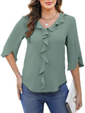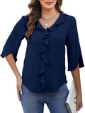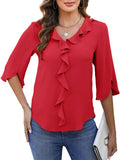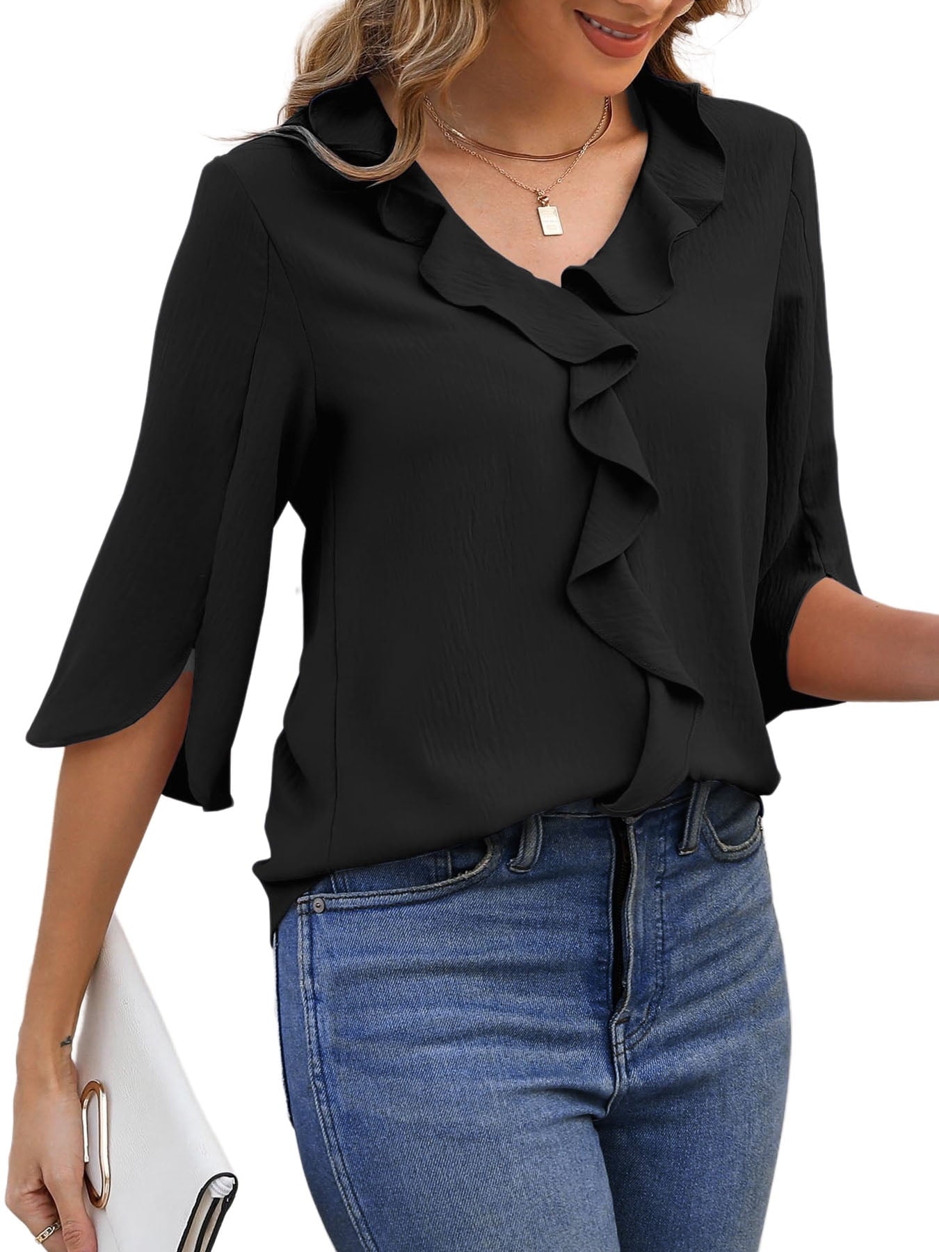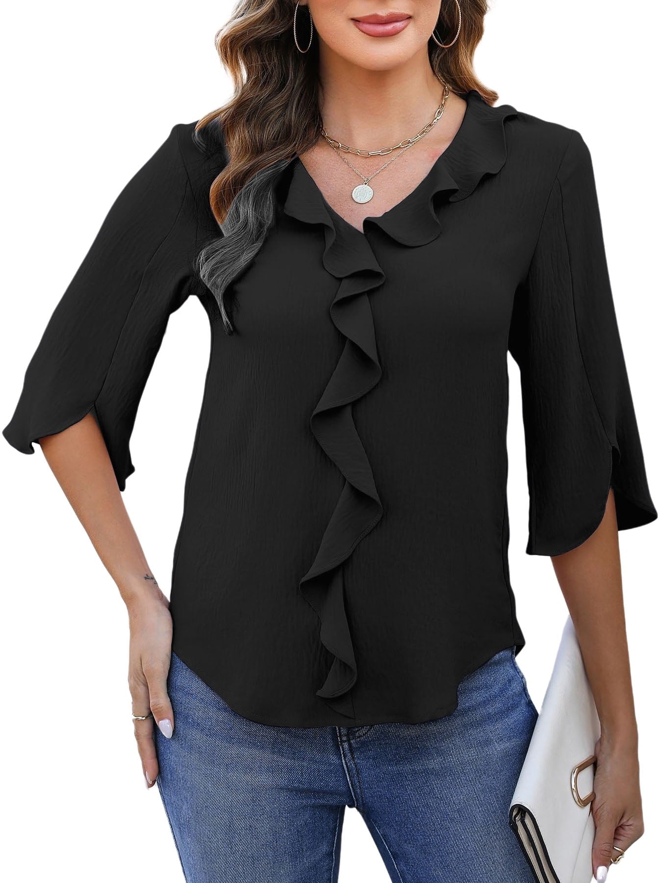 UVN Chiffon Blouses for Women Dressy Ruffle V Neck Tops Summer Casual 3/4 Sleeve Shirts