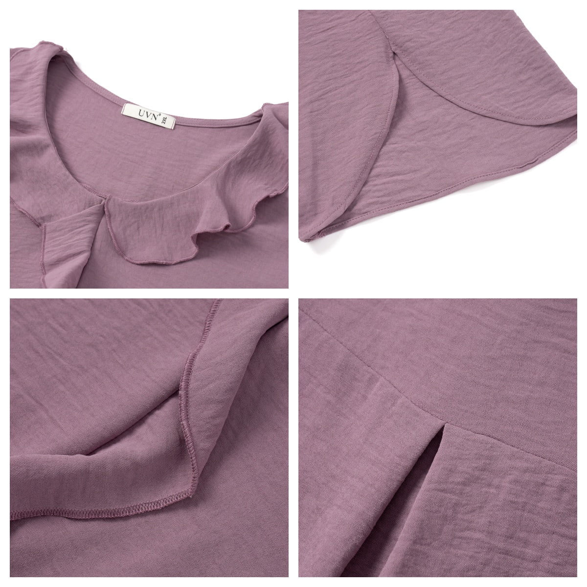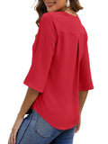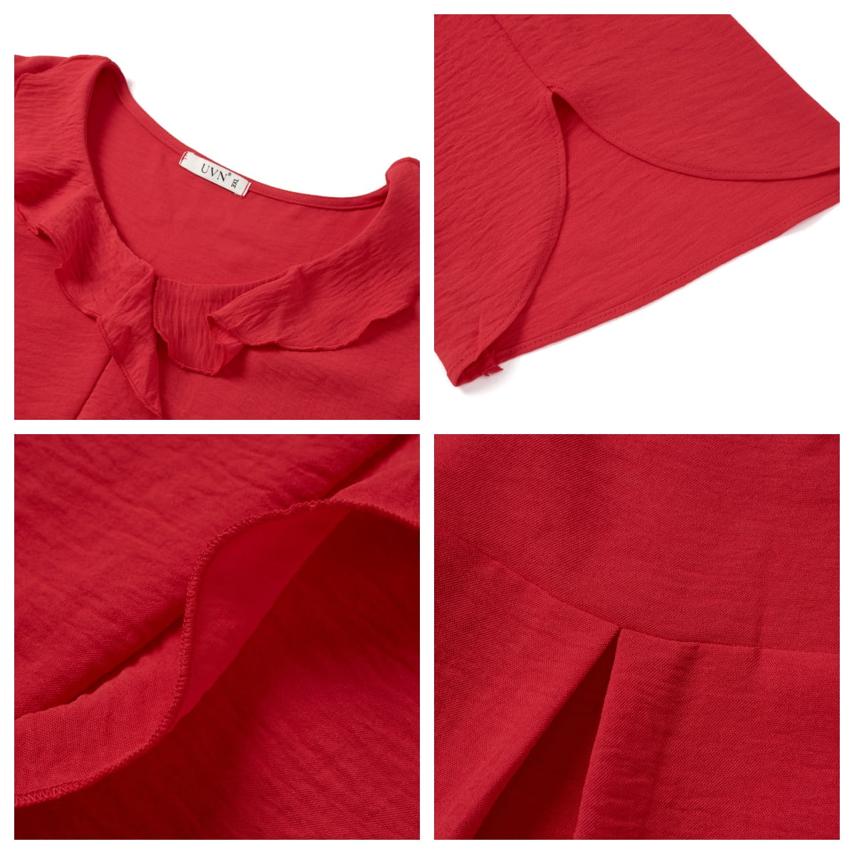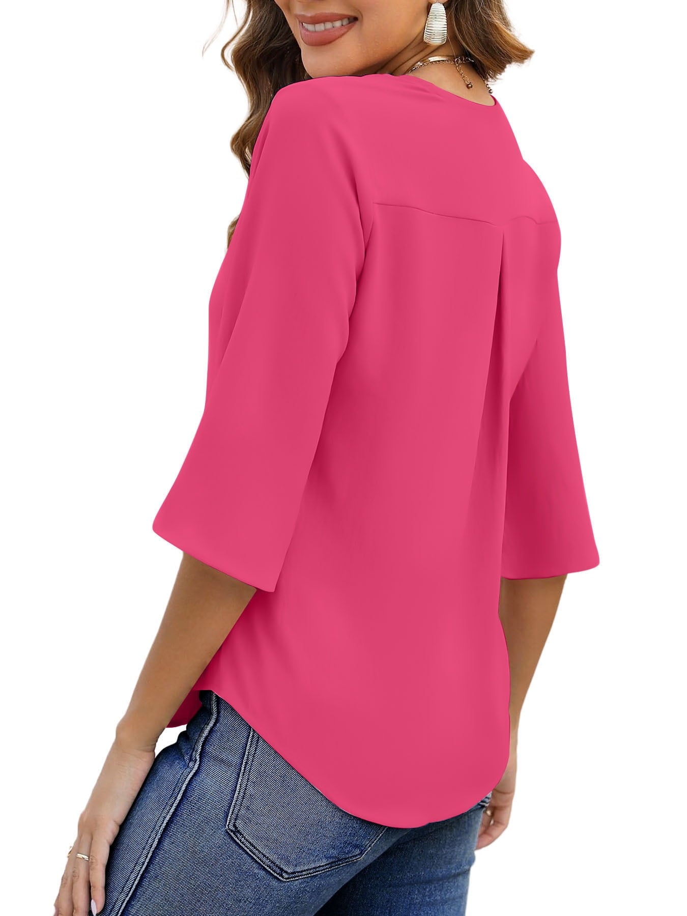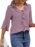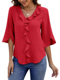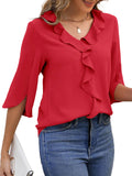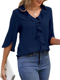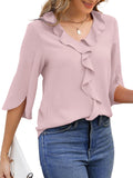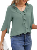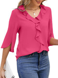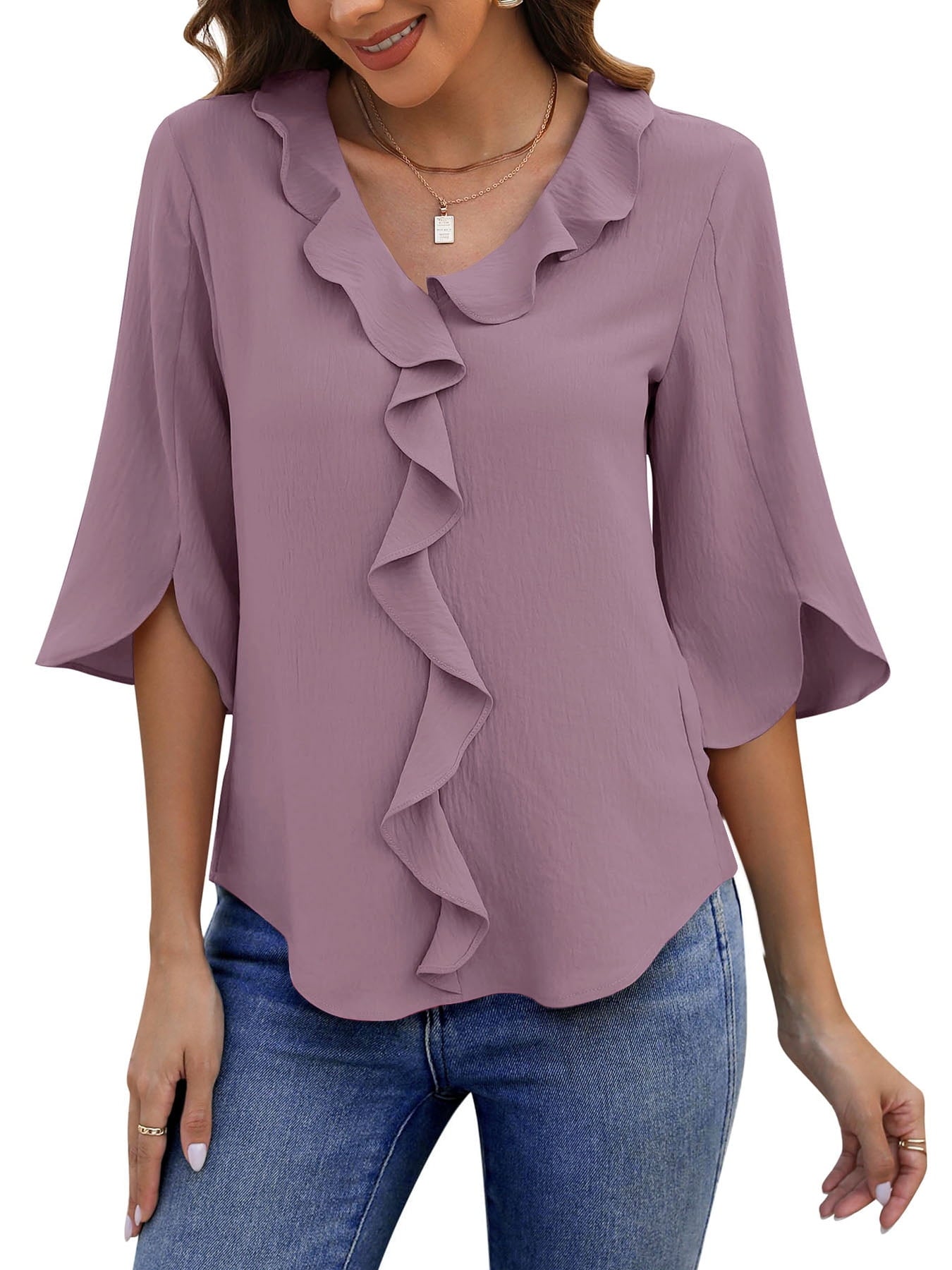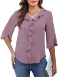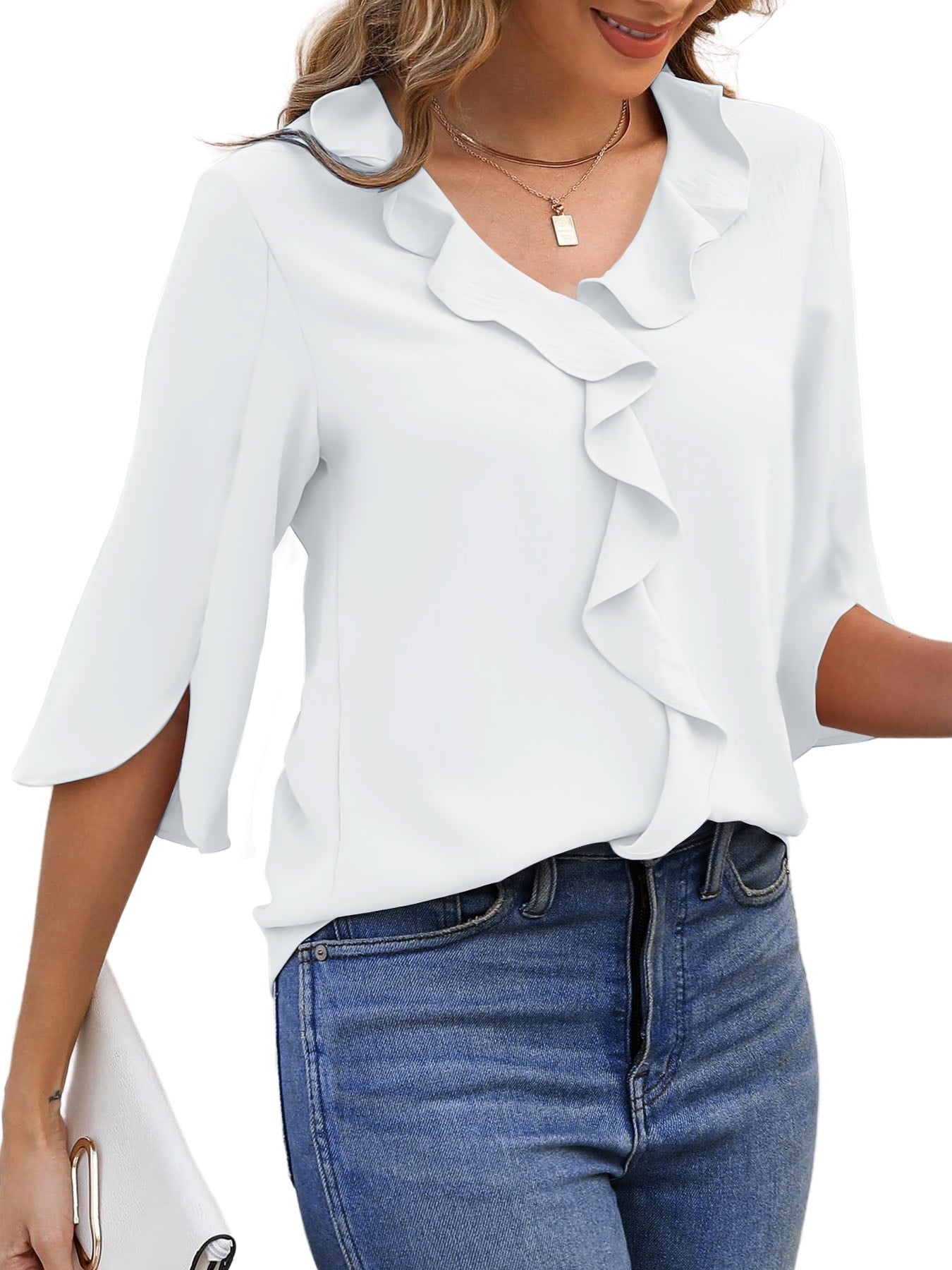 UVN Chiffon Blouses for Women Dressy Ruffle V Neck Tops Summer Casual 3/4 Sleeve Shirts