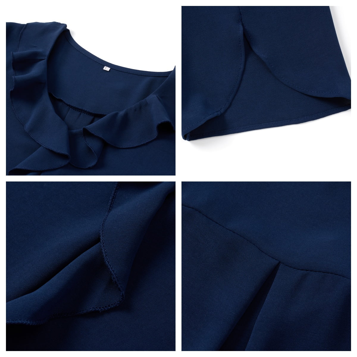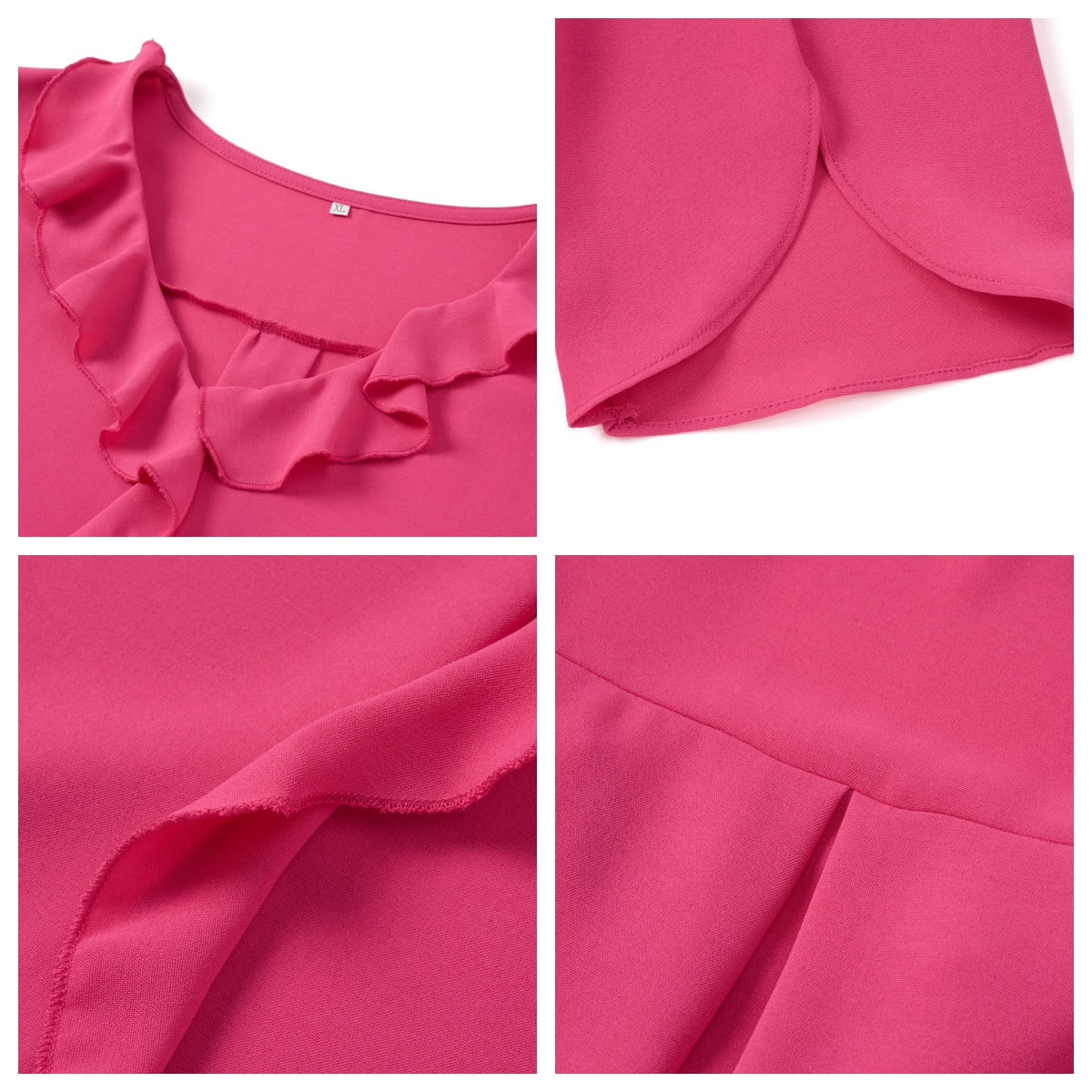 👜【Feature】The chiffon tops for women feature a dressy ruffle design and a pleasing v-neck, making them the perfect choice for women who pursue a fashionable appearance. The v-neck can highlight the neck line, and the 3/4 sleeve design can provide coverage while keeping cool, making it an excellent choice for summer. The curved hem can effectively conceal the abdomen and buttocks, making it very feminine and elegant. There are multiple sizes of chiffon tops to choose from, suitable for different body types, providing a slim fitting wearing experience for every woman.