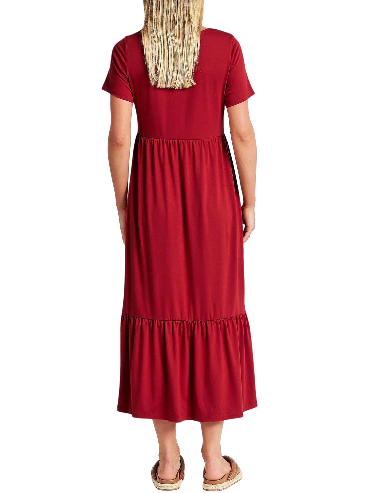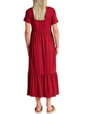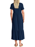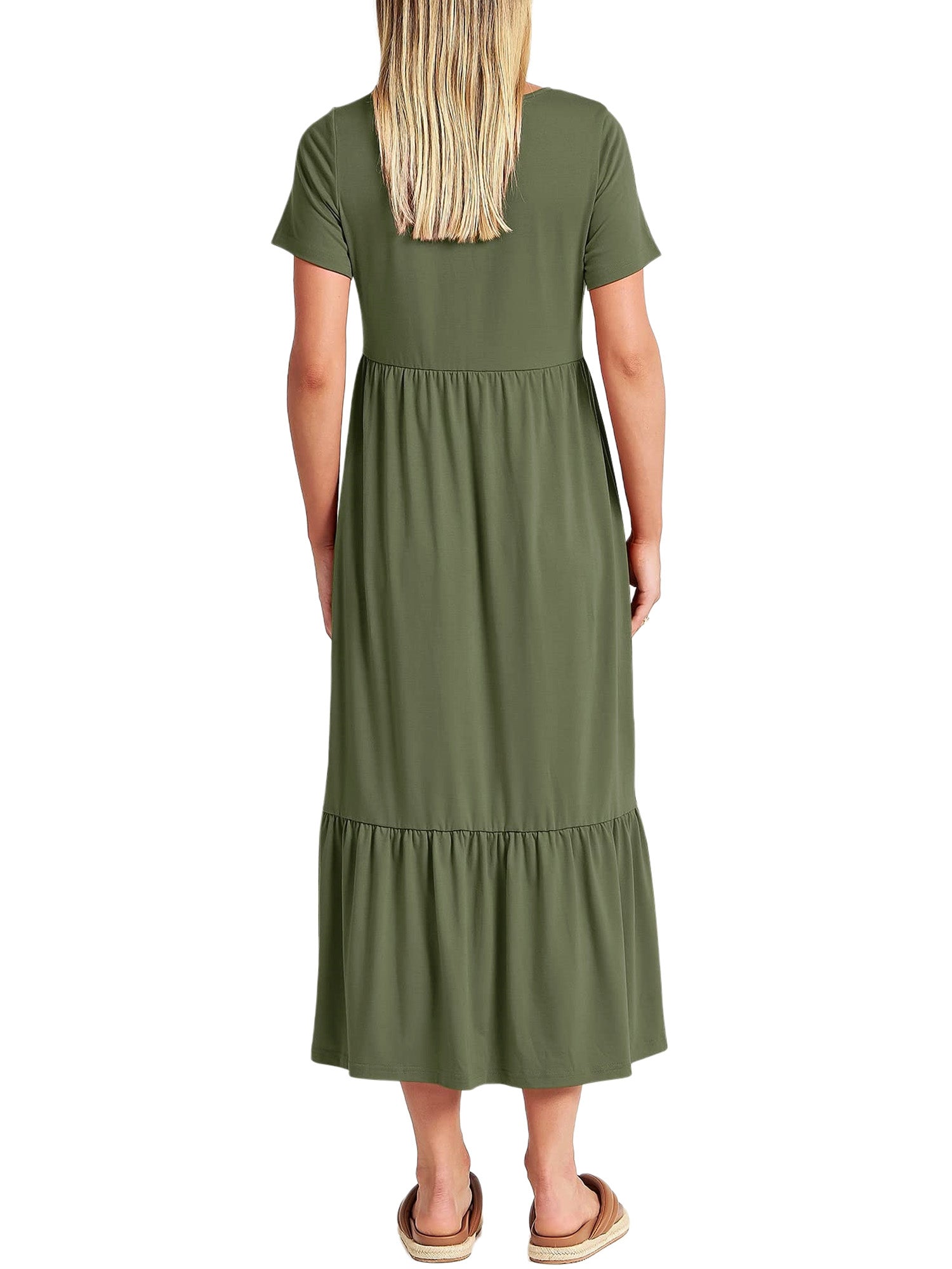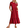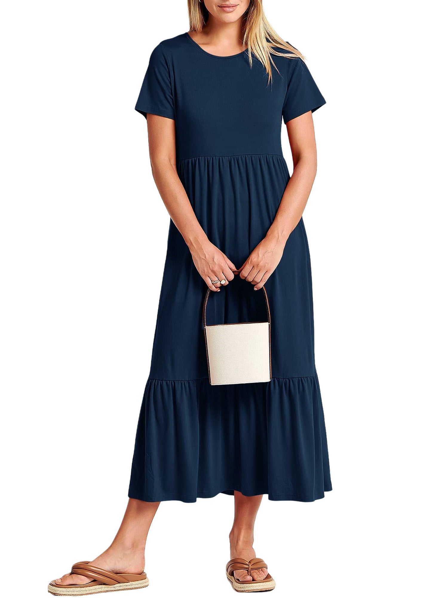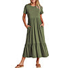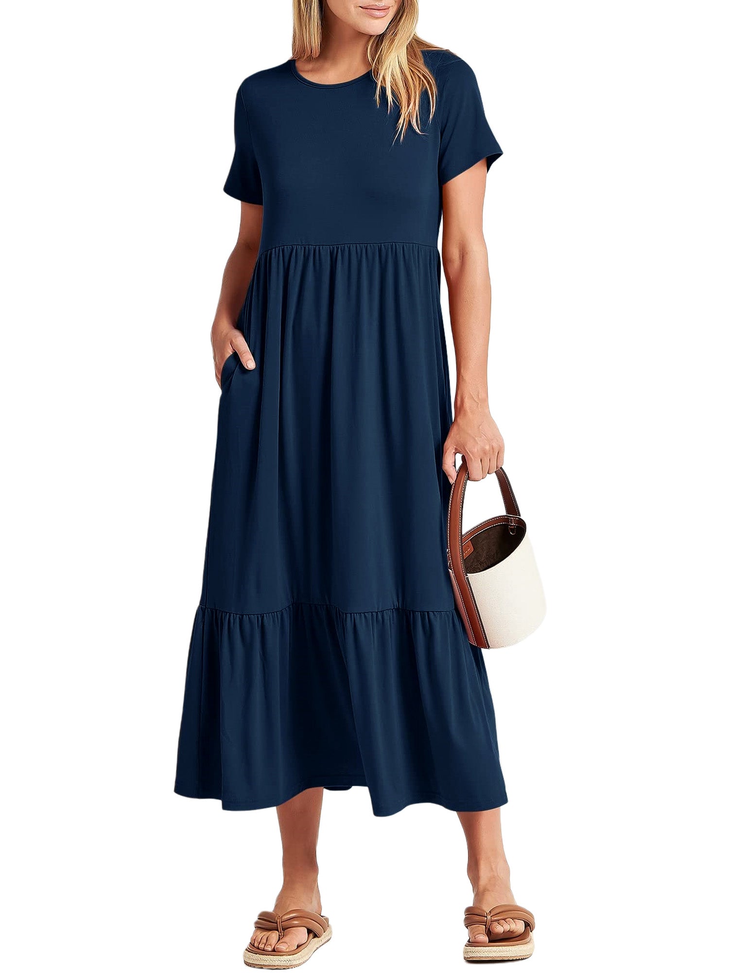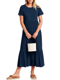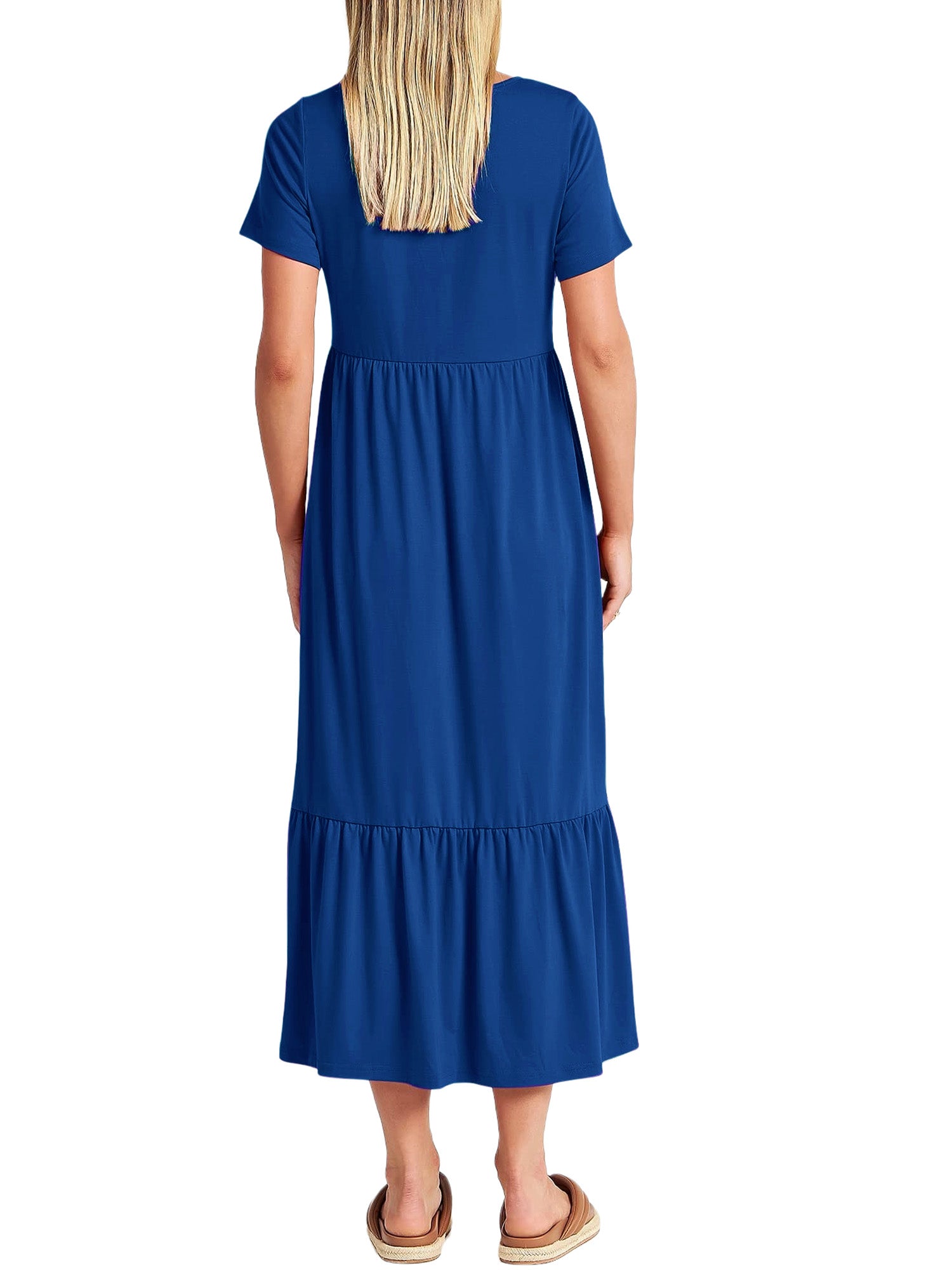 The beach dress has A-line silhouette and tiered design creates a flattering, flowy look that moves gracefully with every step, while the short sleeves and crewneck add a touch of simplicity and ease. The addition of pockets adds to its practicality, allowing for hands-free convenience. Whether paired with sandals for a laid-back vibe or dressed up with accessories, this trendy maxi dress is a wardrobe essential for effortless summer fashion.
