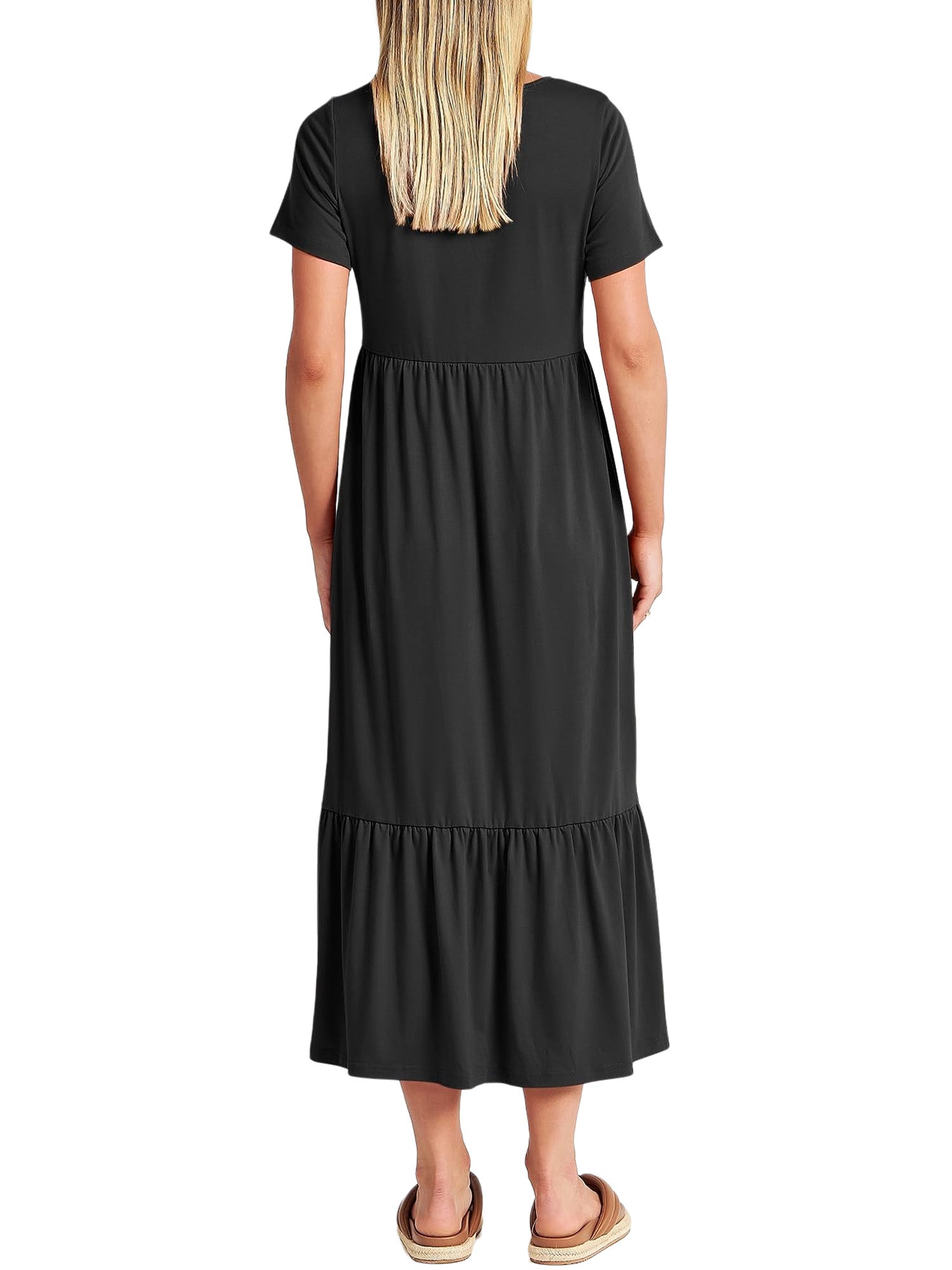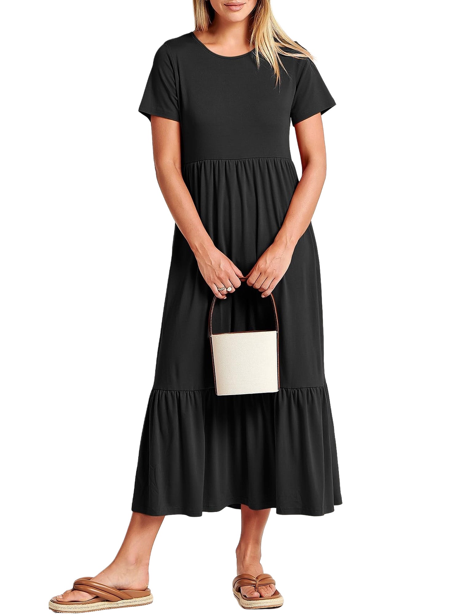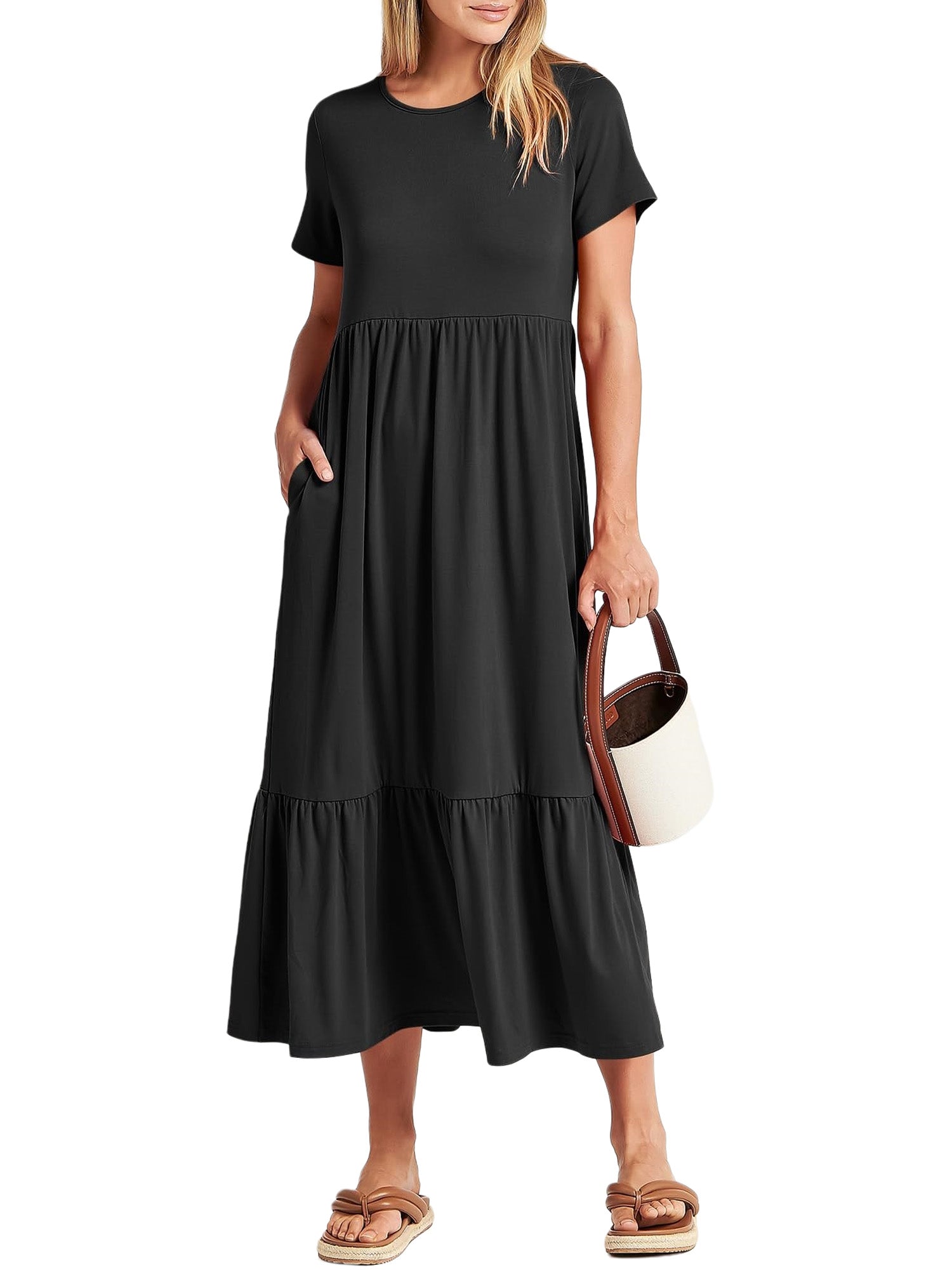 ✿【 Features 】: This long dresses for women has a elegant and functional design, the maix dress has a classic crewneck, short sleeves, and an A-line silhouette, this black dress exudes timeless charm. The tiered design adds volume and flair, creating a flowy, graceful movement. Side pockets add functionality to the style, allowing you to carry small essentials effortlessly. The midi length with tiered design makes the sundress less monotonous.