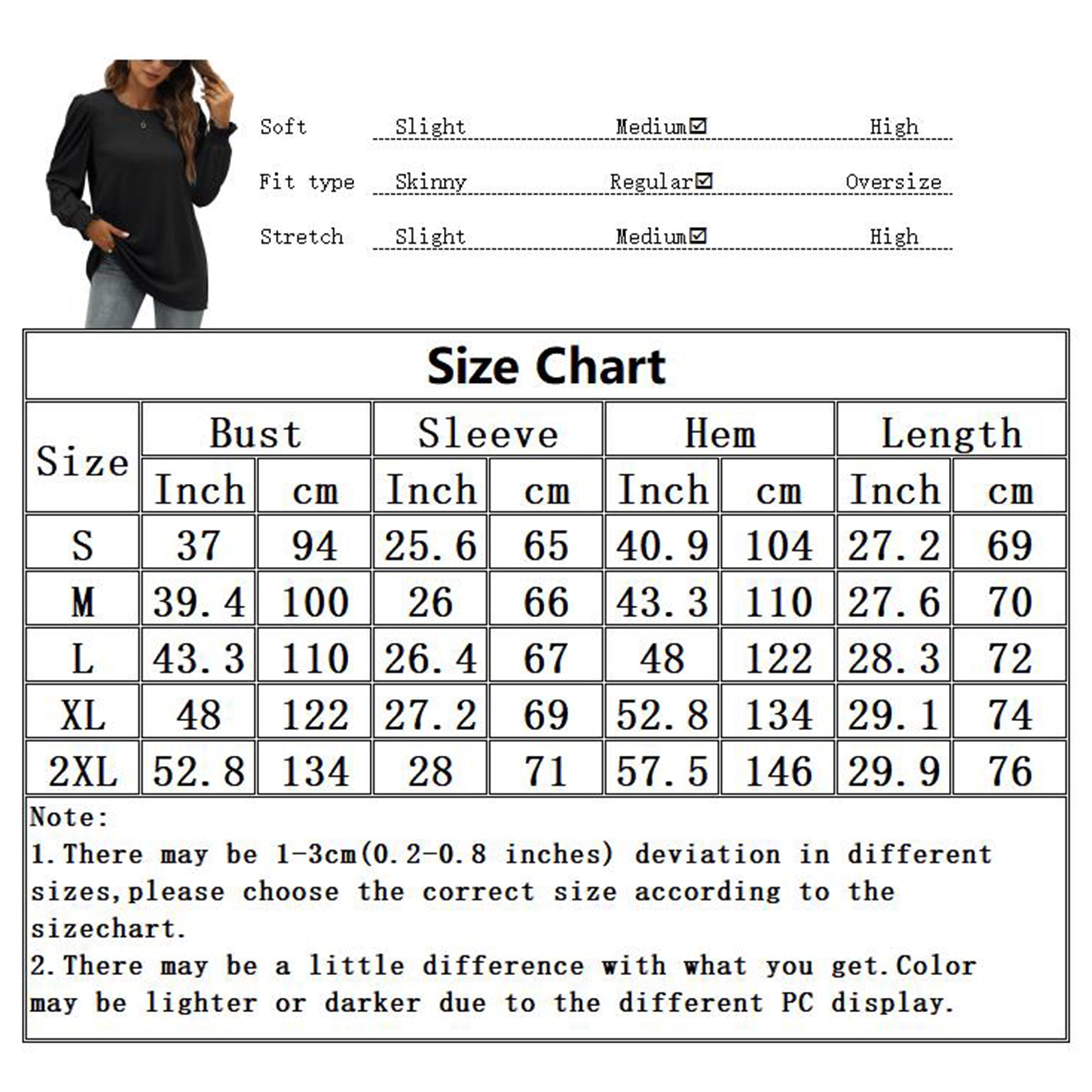 S ----Bust 94cm/37.01" ---Length 69cm/27.17"---Sleeve 65cm/25.59"---Hem 104cm/40.94"
