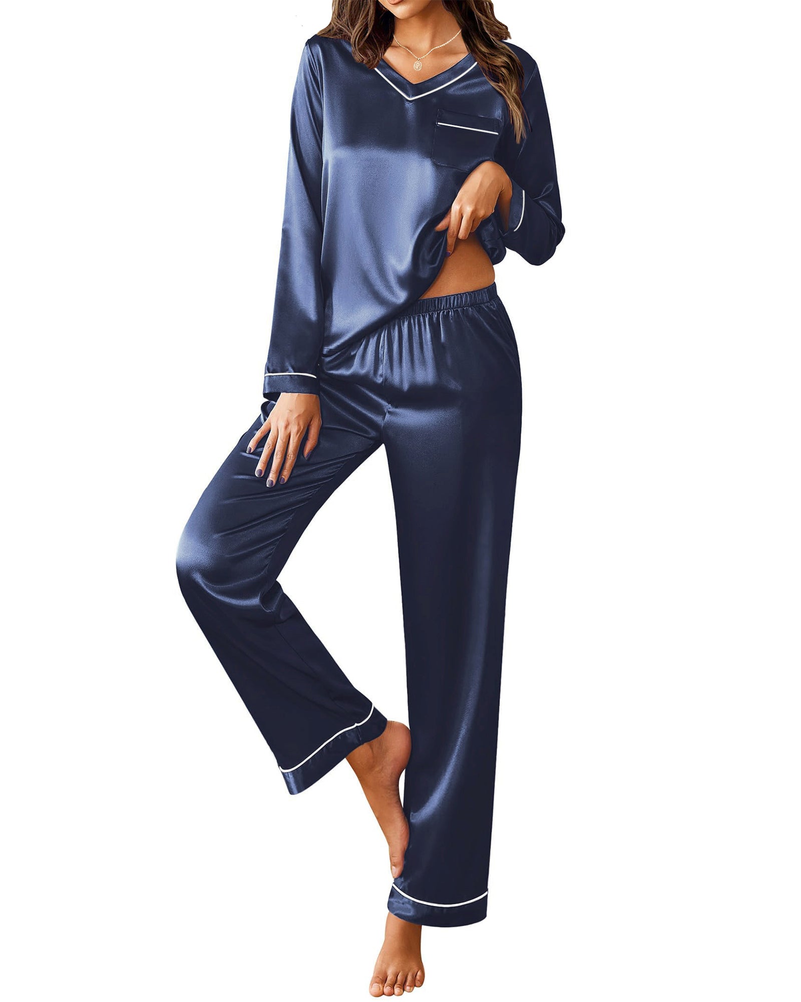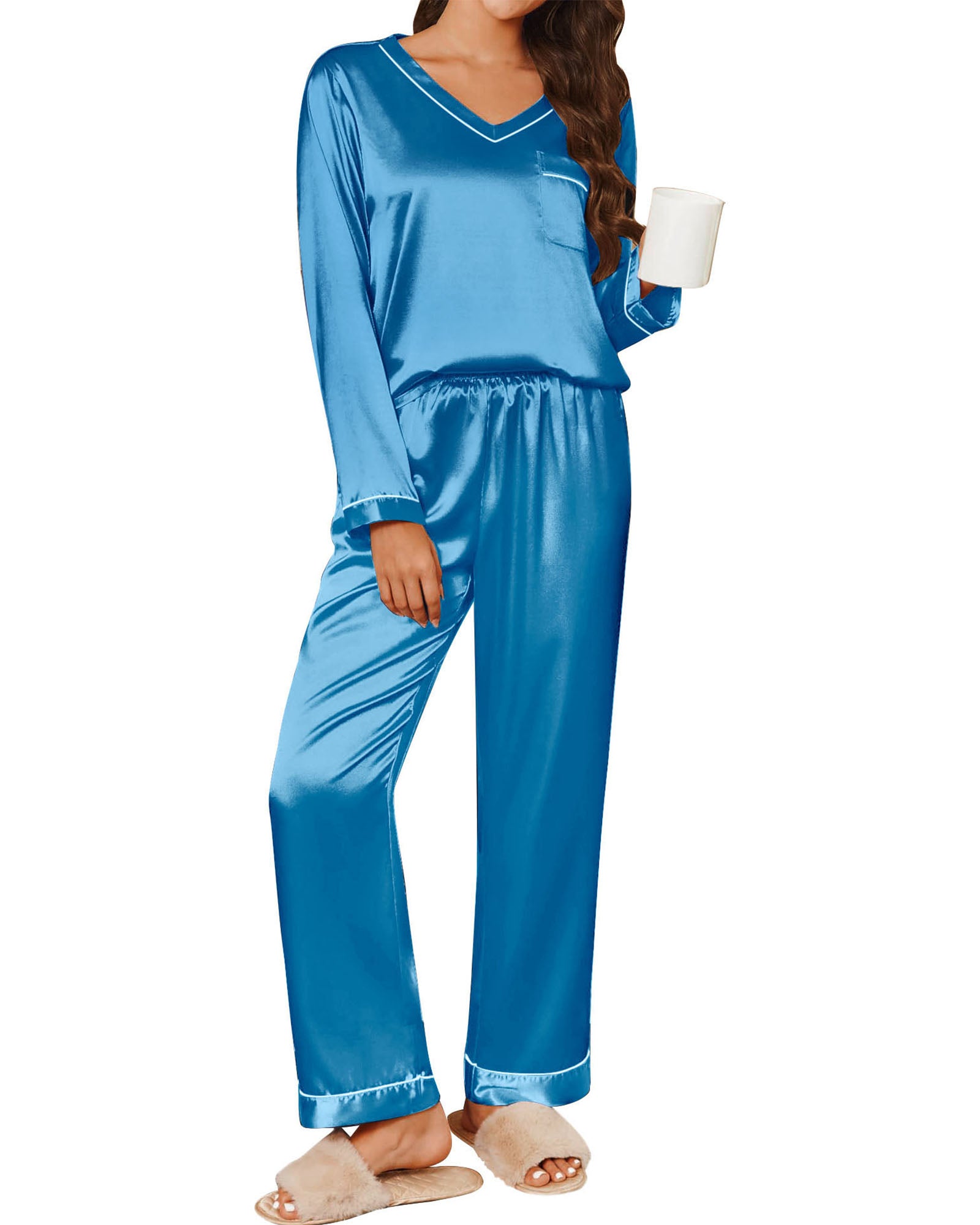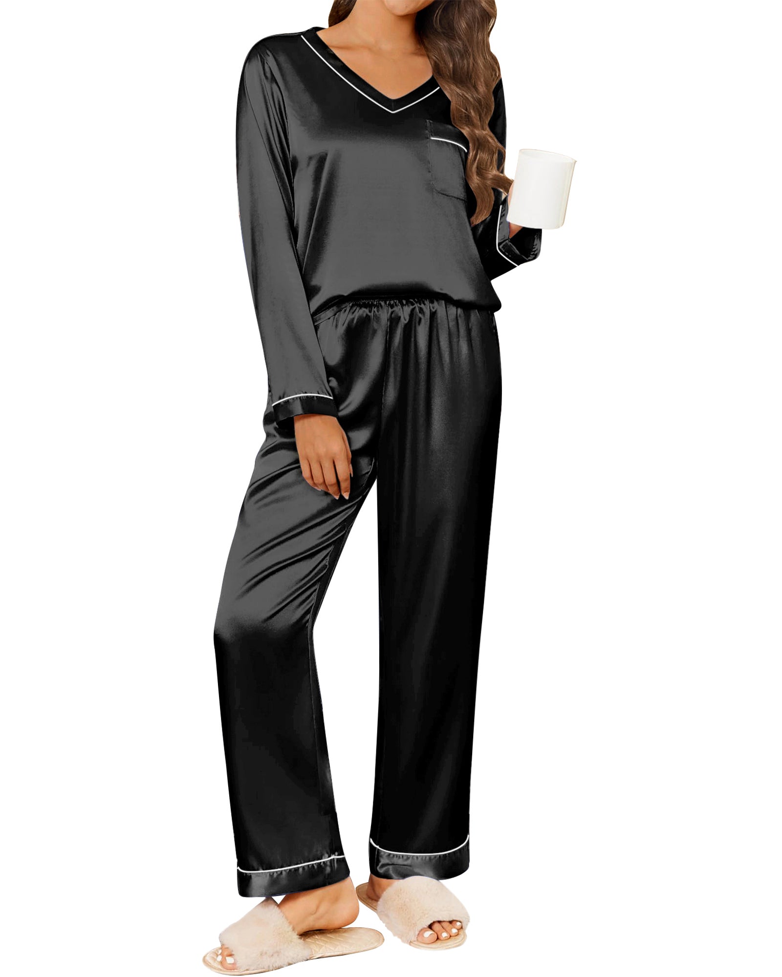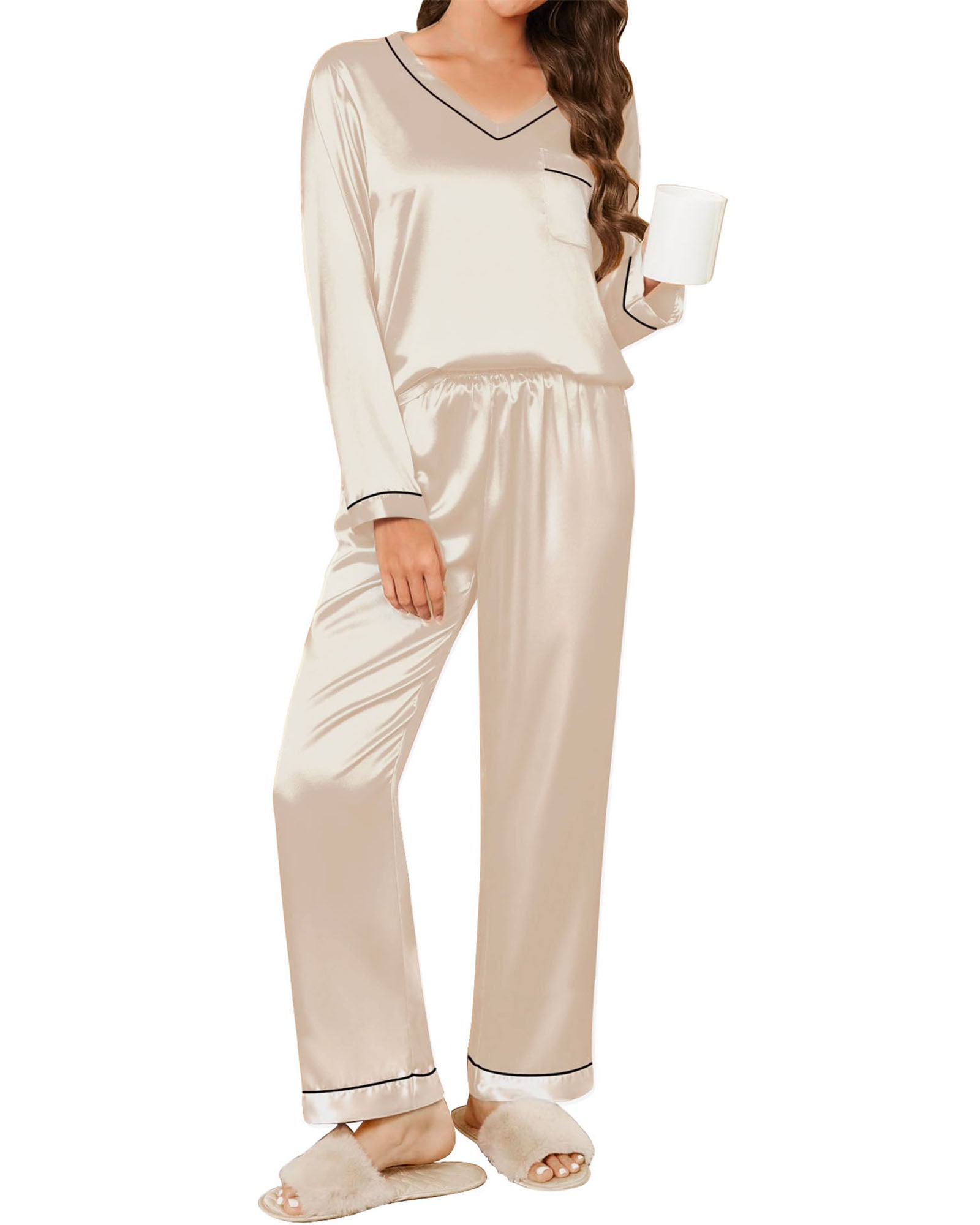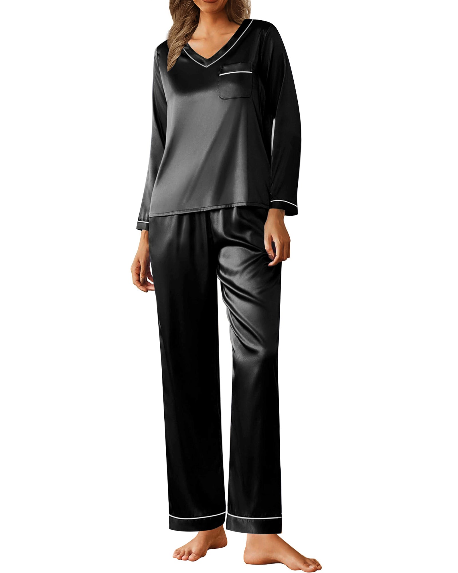 πγFeaturesγLong sleeve top, v neck, soild color, smooth satin top with chest pocket. The loose cut can show your body curve while giving you a burden-free wearing experience. Loose fit design to ensure you sleep very comfortably.