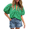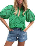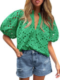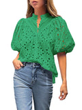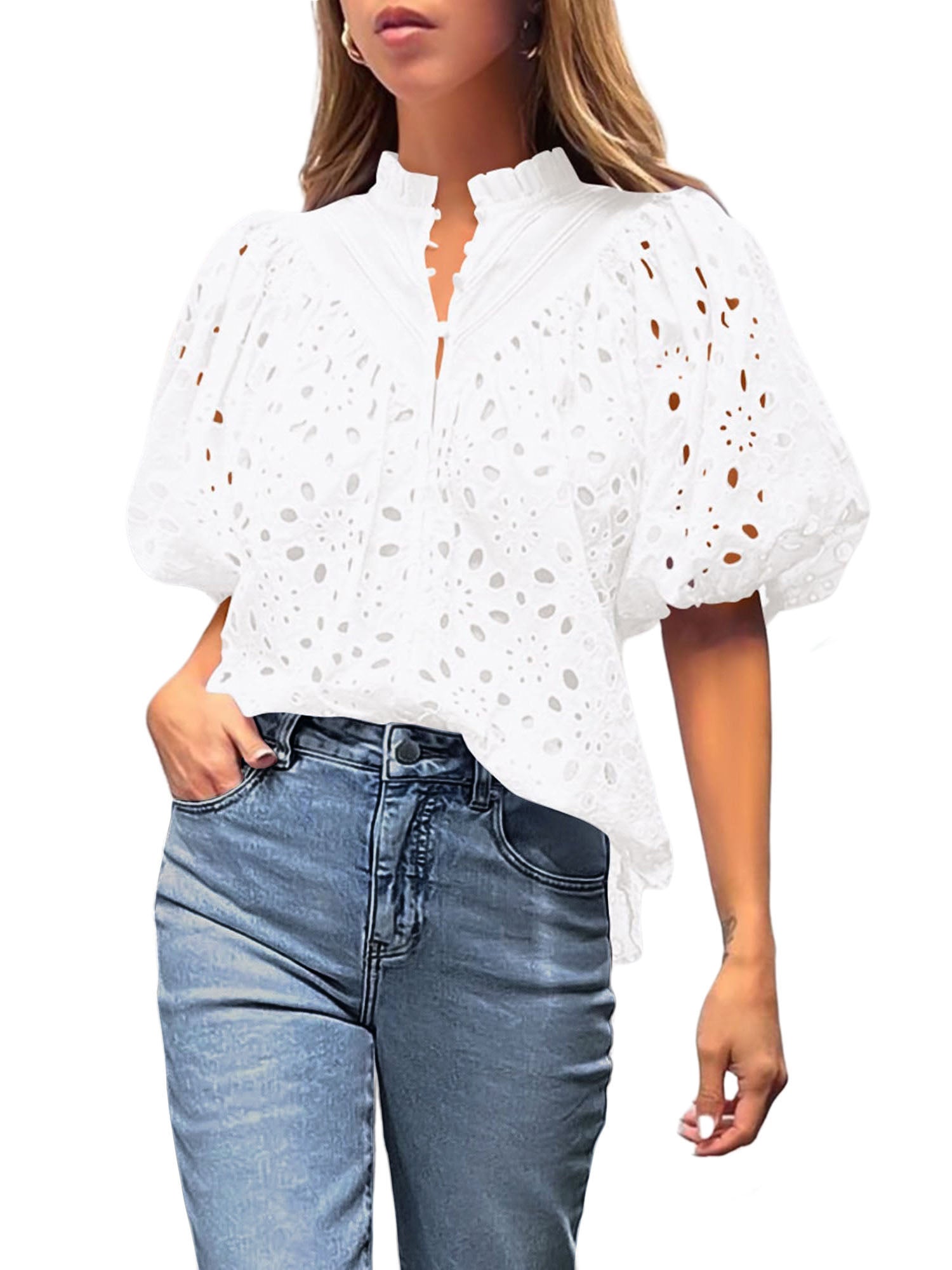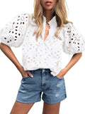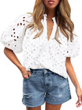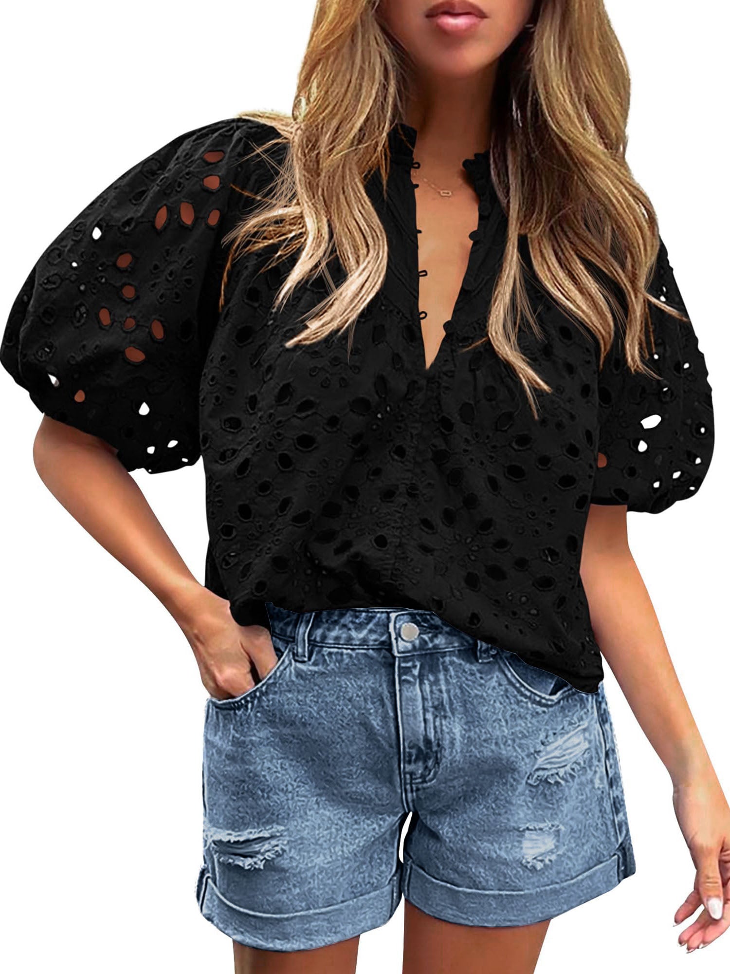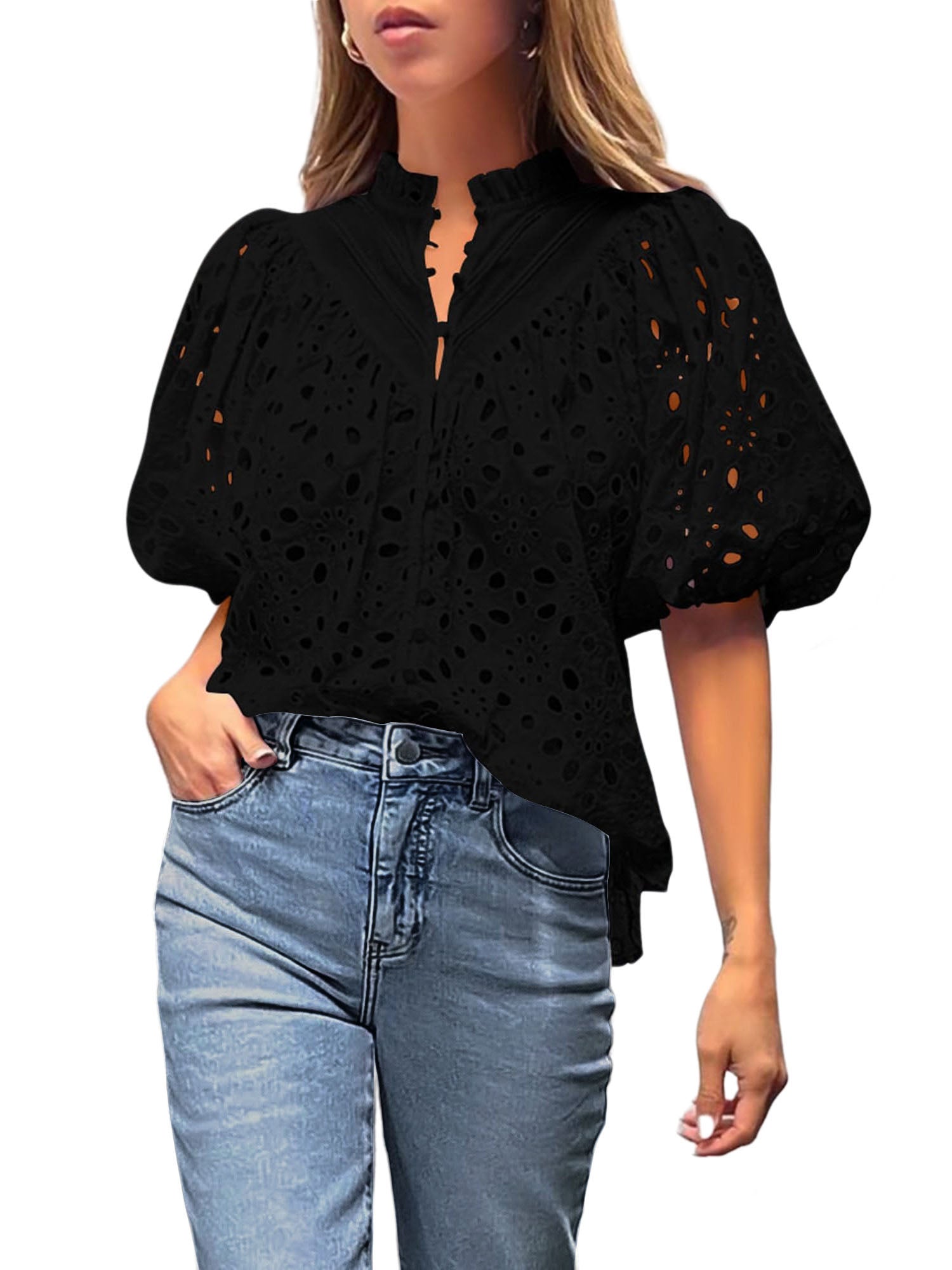 ✿【Features】: This long sleeve shirts for women features a sophisticated V-neck design that beautifully elongates the neck, combined with short lantern sleeves that add a chic, voluminous touch. Th ewomens tops intricate hollow-out lace and embroidered details on the front bring a feminine and elegant look to the blouse, making it an ideal choice for both casual and dressy occasions. The upper half buttons of these trendy tops for women can be effortlessly opened or closed acccording to your preference, offering a practical and fashionable detail that enhances the overall look. The women blouse with short lantern sleeves offer a breezy, feminine silhouette, ideal for staying cool in hot weather.