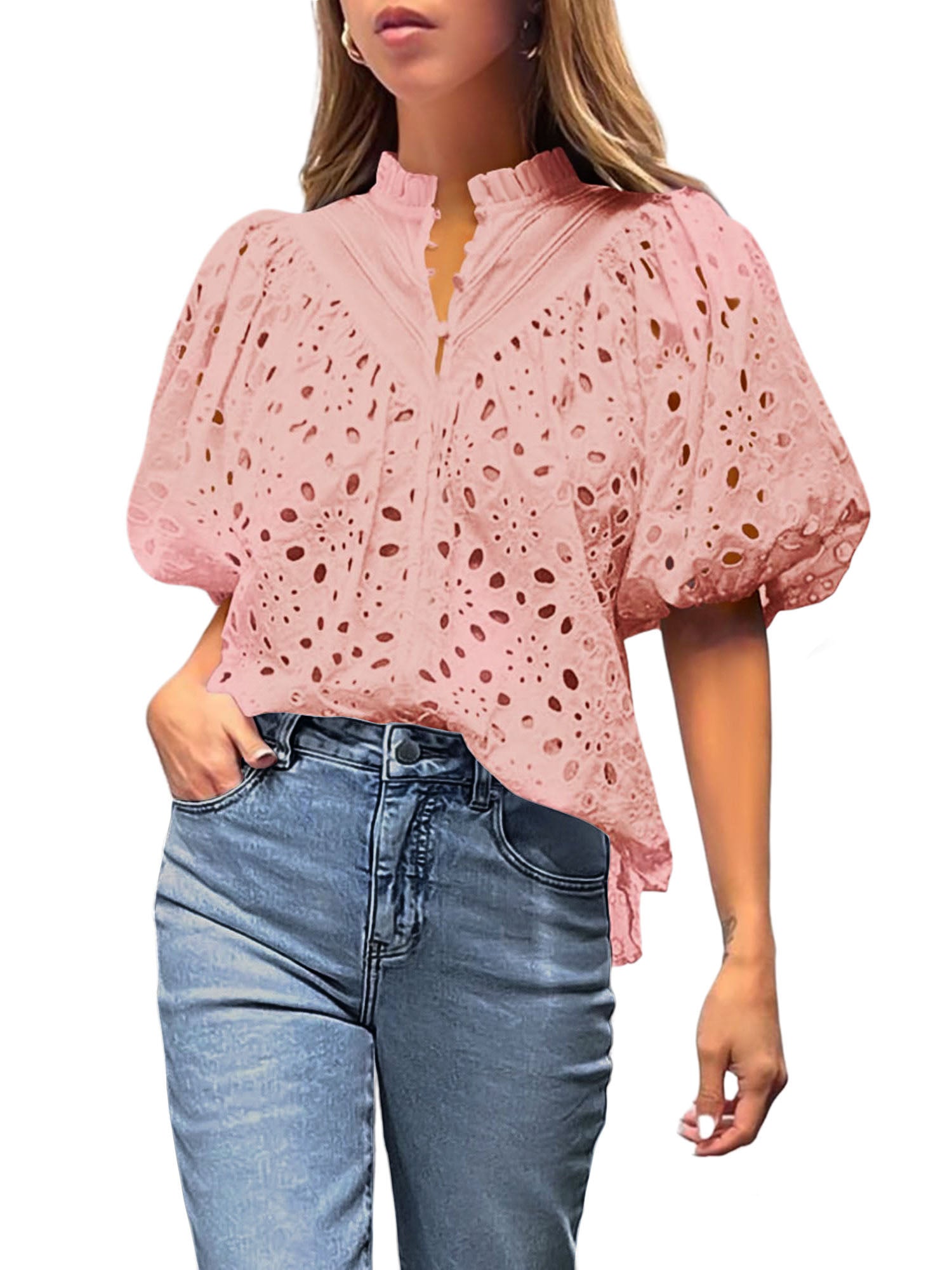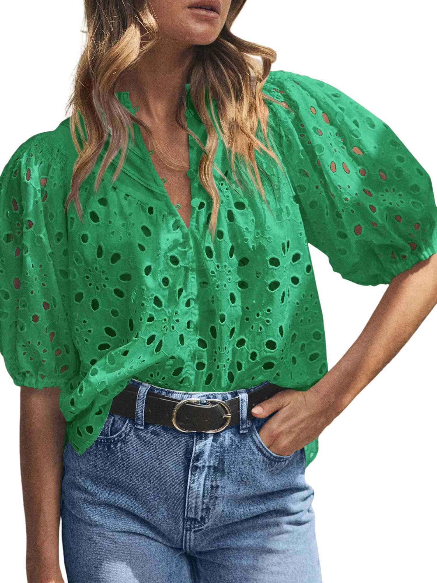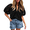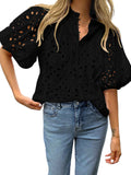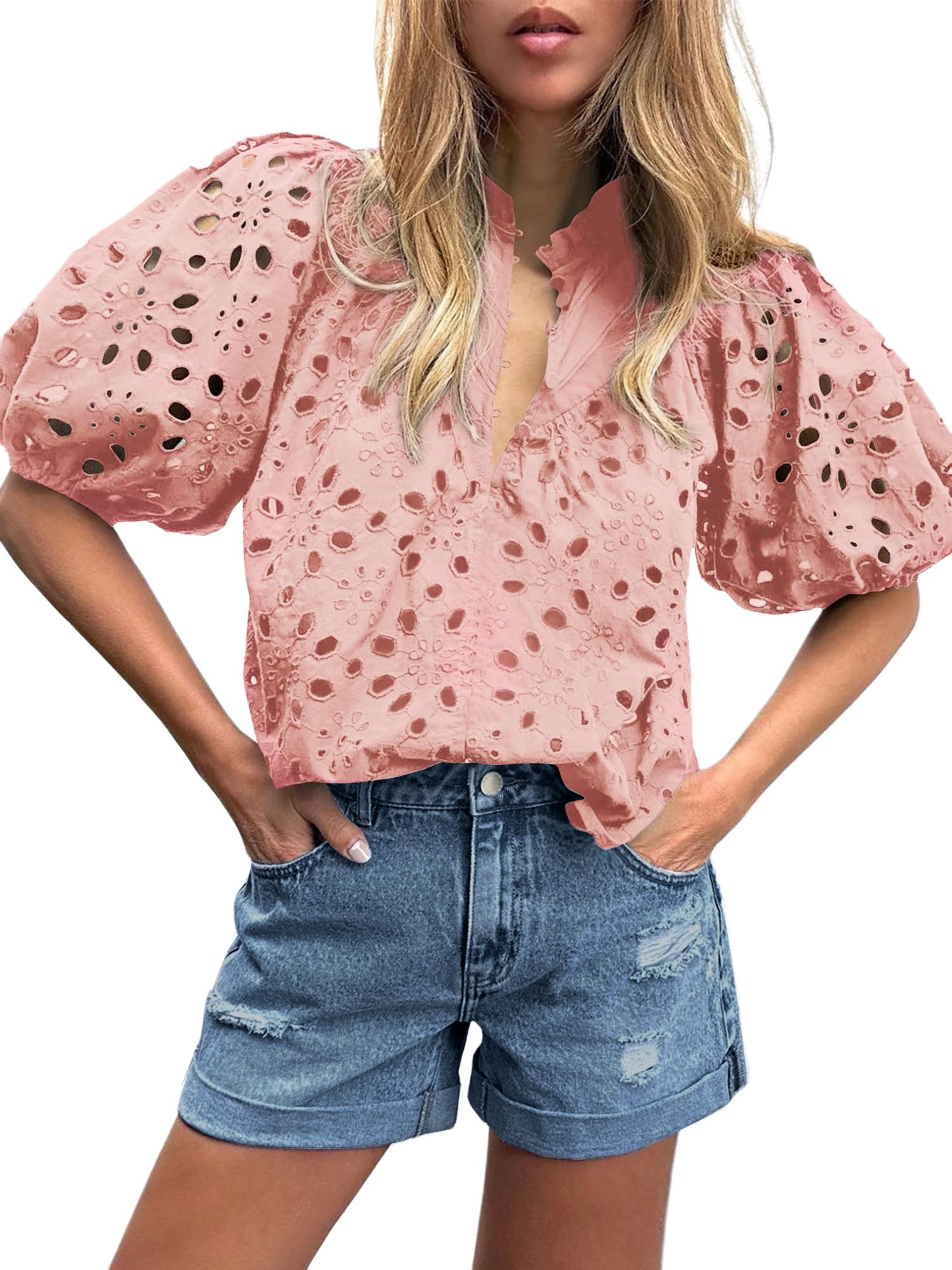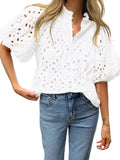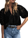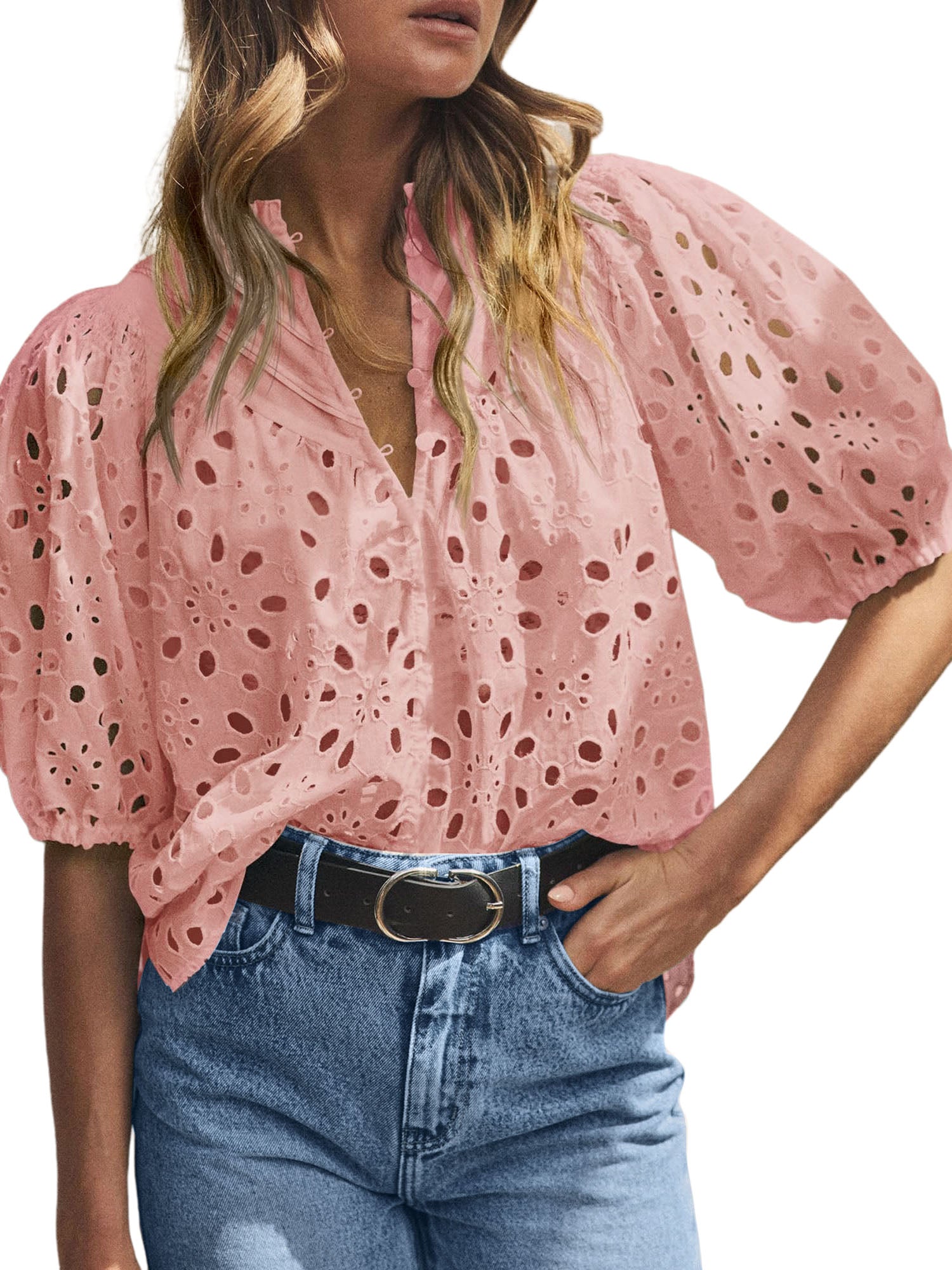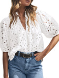 The lace blouse for woman offer a perfect blend of elegance and comfort, making them ideal for warm weather. Crafted from lightweight, breathable fabric, these summer blouses feature a flattering V-neck design and stylish short lantern sleeves, adding a touch of feminine flair. The intricate lace embroidery and hollow-out details provide a delicate, chic look, while the button closure adds a refined finish. Whether worn for casual outings or dressy occasions, these blouses pair effortlessly with jeans, skirts, or trousers, making them a versatile addition to any summer wardrobe. With their combination of soft textures and sophisticated design, they offer a perfect balance of casual style and dressed-up appeal.