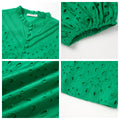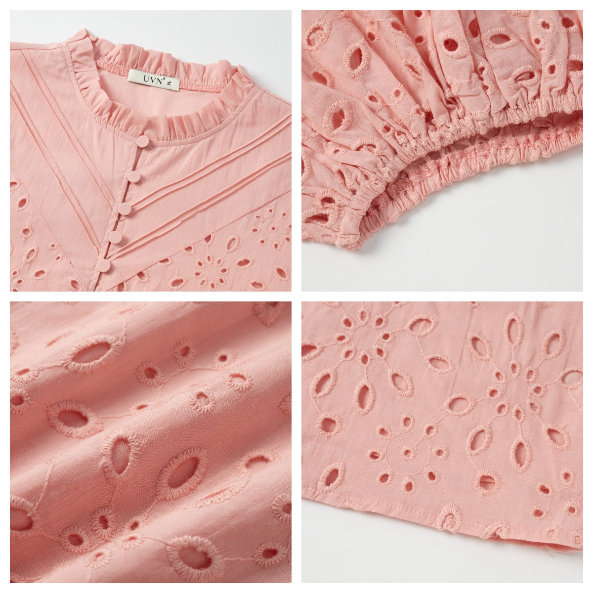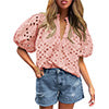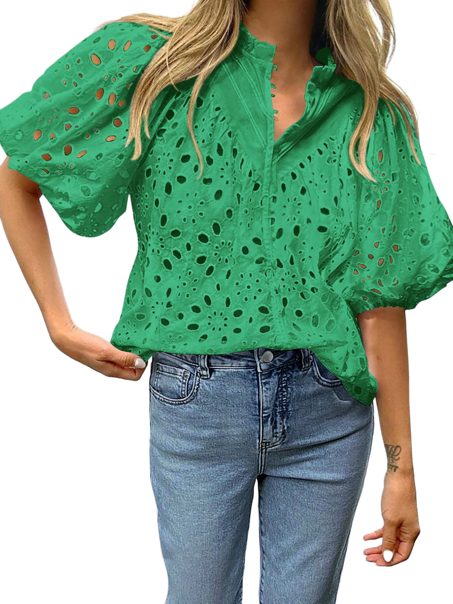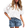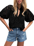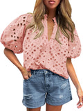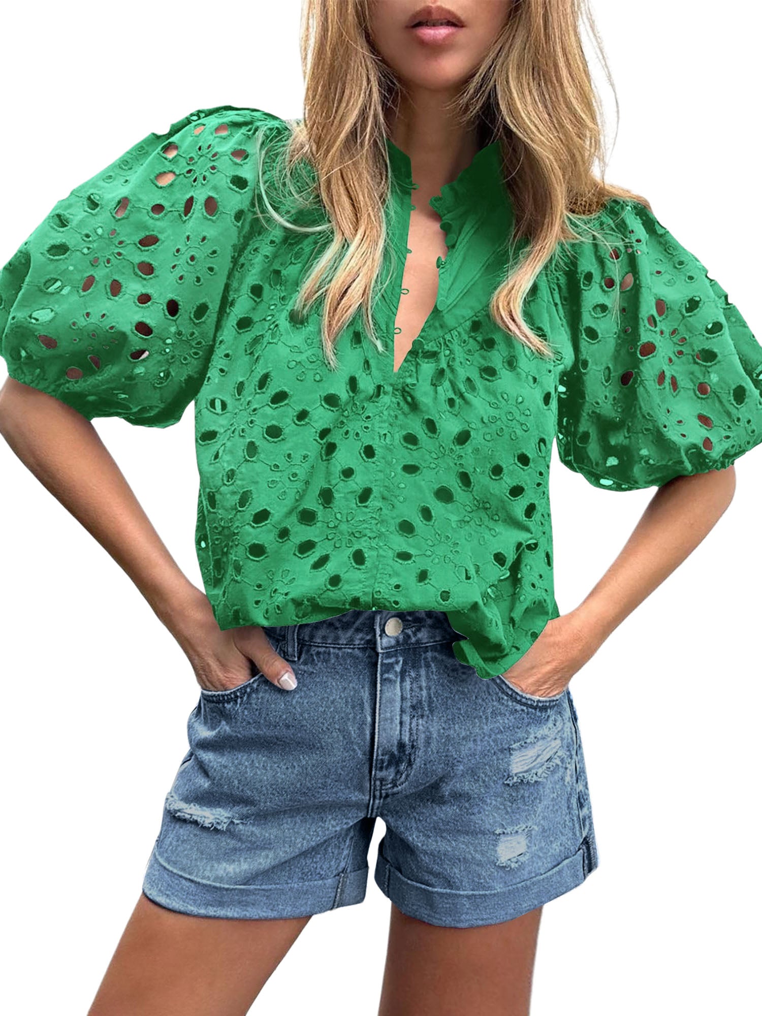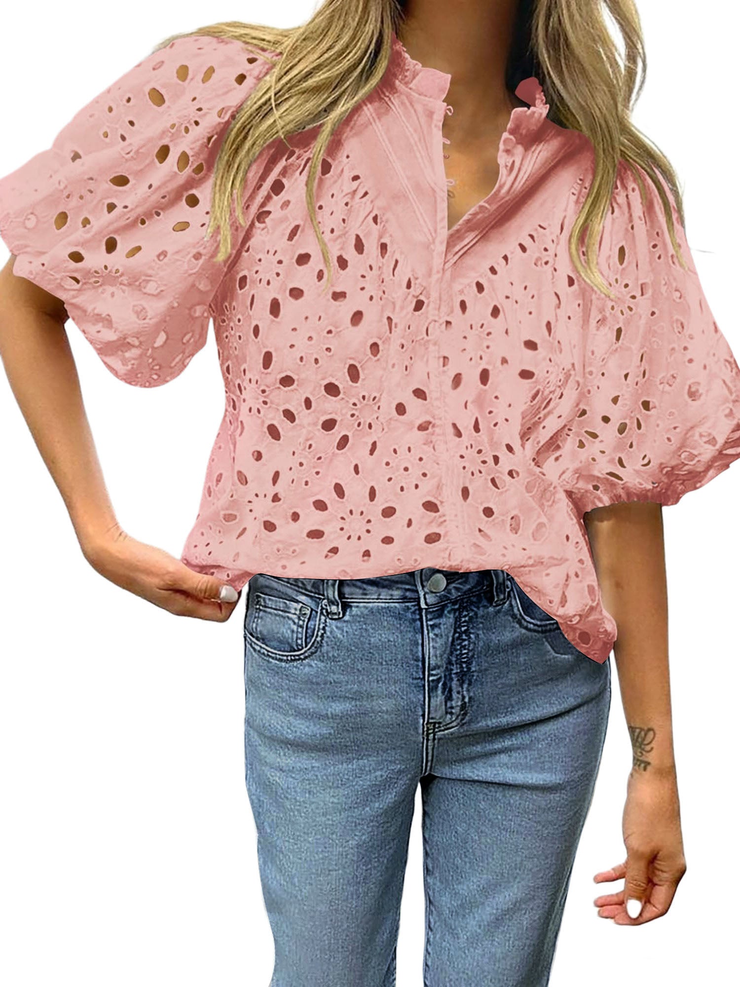 The lace blouse for woman offer a perfect blend of elegance and comfort, making them ideal for warm weather. Crafted from lightweight, breathable fabric, these summer blouses feature a flattering V-neck design and stylish short lantern sleeves, adding a touch of feminine flair. The intricate lace embroidery and hollow-out details provide a delicate, chic look, while the button closure adds a refined finish. Whether worn for casual outings or dressy occasions, these blouses pair effortlessly with jeans, skirts, or trousers, making them a versatile addition to any summer wardrobe. With their combination of soft textures and sophisticated design, they offer a perfect balance of casual style and dressed-up appeal.