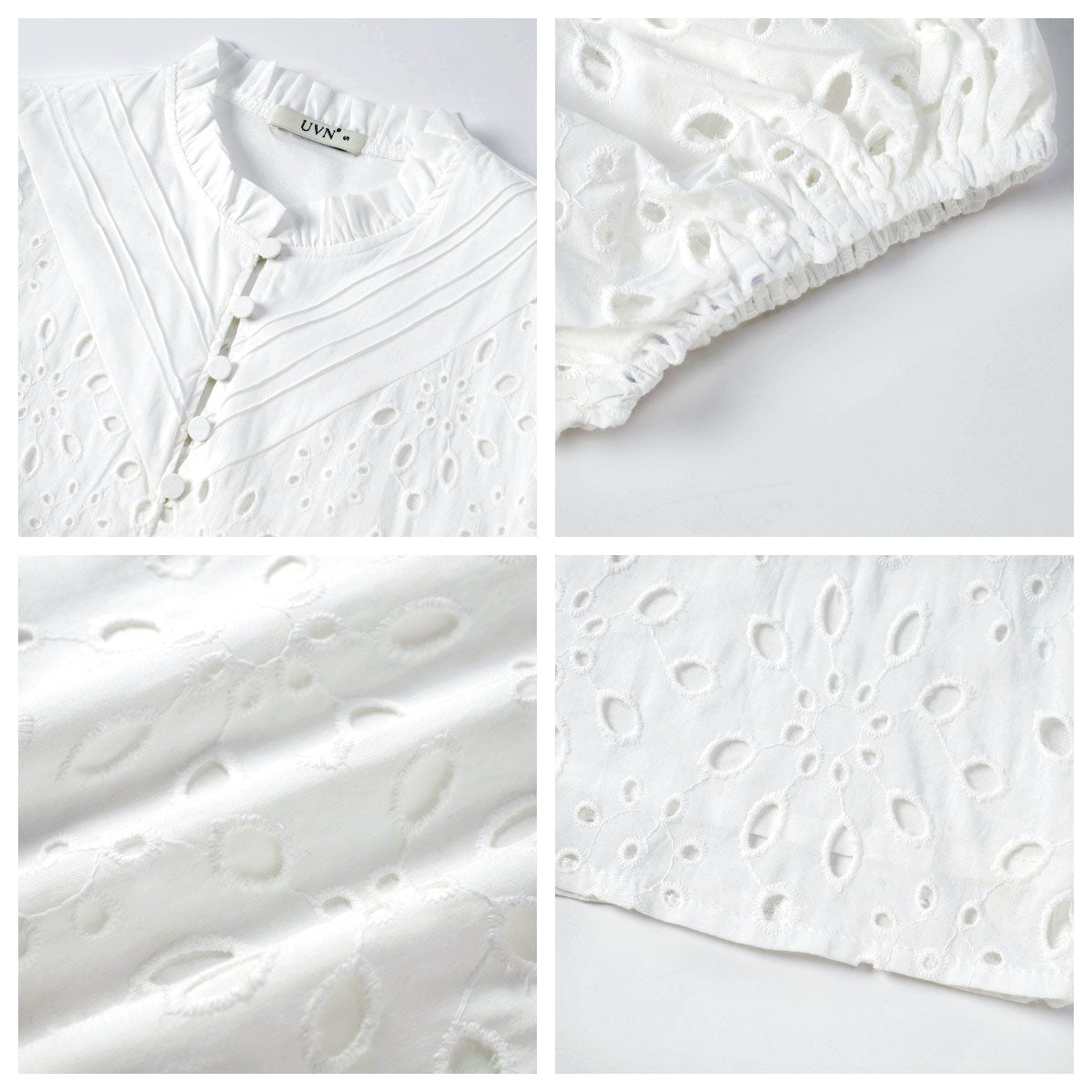 UVN Summer Blouses for Women Short Sleeve Shirts Ladies Hollow Out Lace Blouse V Neck Dressy Casual Tops
