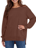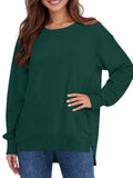 The women oversized sweatshirt, a must-have for your fall wardrobe. Crafted from a premium polyester blend, this sweatshirt offers ultimate comfort and durability. Its trendy design features a crew neck, long sleeves, and a relaxed drop shoulder fit, making it a stylish yet cozy choice for any casual occasion. The unique irregular hem and side slits add a fashionable twist to this solid color pullover. Whether you're lounging at home, running errands, or meeting friends, this loose jumper provides the perfect blend of comfort and style. Pair it with jeans or leggings for an effortlessly chic look.