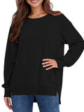 ✿【Features】: This black sweatshirt features a trendy oversized fit with a crew neck and long sleeves, providing a relaxed and laid-back look. The drop shoulder design adds a touch of modern style, while the irregular hem and side slits give it a unique and fashionable edge. The solid color tops design makes it easy to pair with any outfit, while the oversized fit ensures a comfortable and flattering silhouette. The slit details and irregular hem add a touch of uniqueness, making this sweatshirt stand out in your wardrobe.