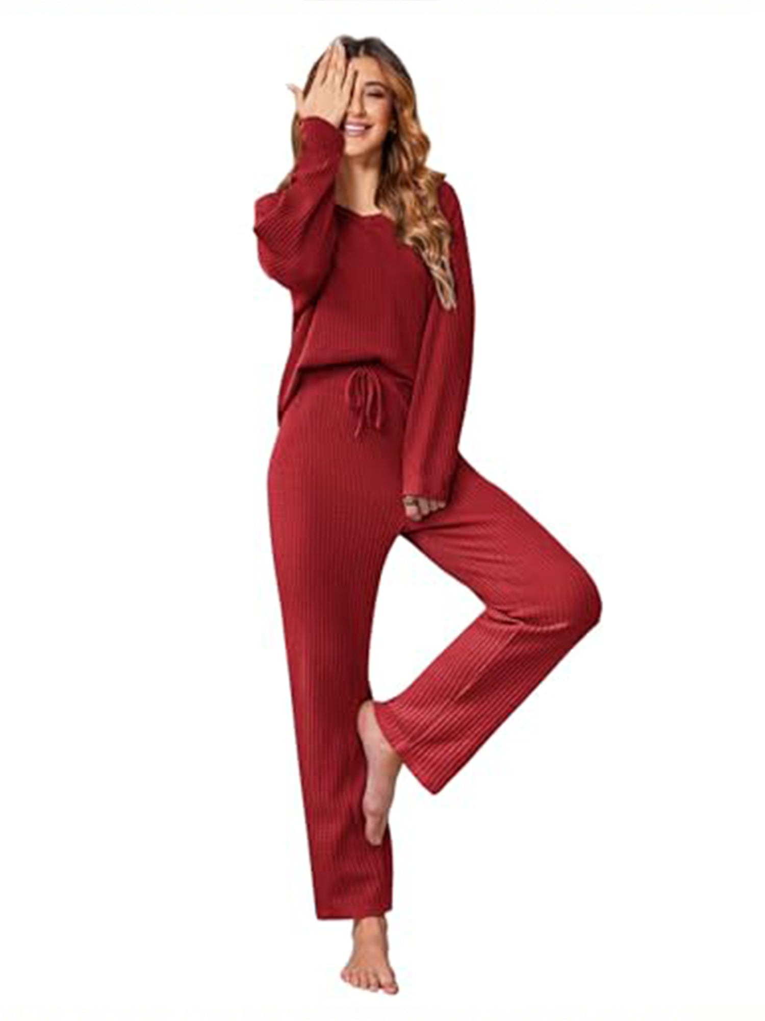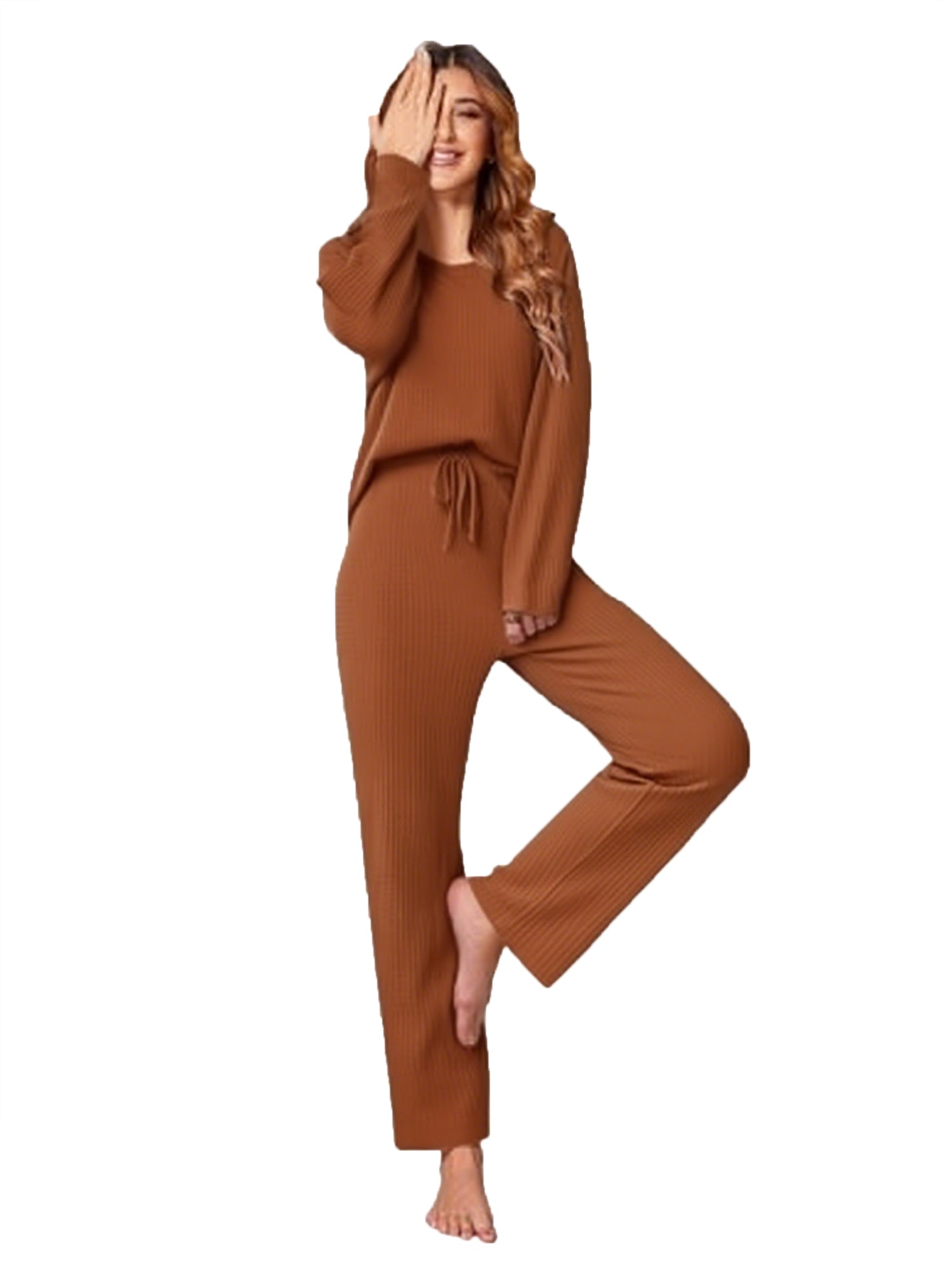 🏝️【Feature】This casual womens loungewear set has a pullover top that features crew neck and casual loose fit. This cute long sleeve waffle top is full of stretchy, perfect for relaxing. Pajama pants with soft elastic waist that fits for any body size. 2 piece sweatsuits for women set have curved foot mouth, exquisite and unique. There are pockets on both sides, you can put mobile phones, small snacks in the pockets