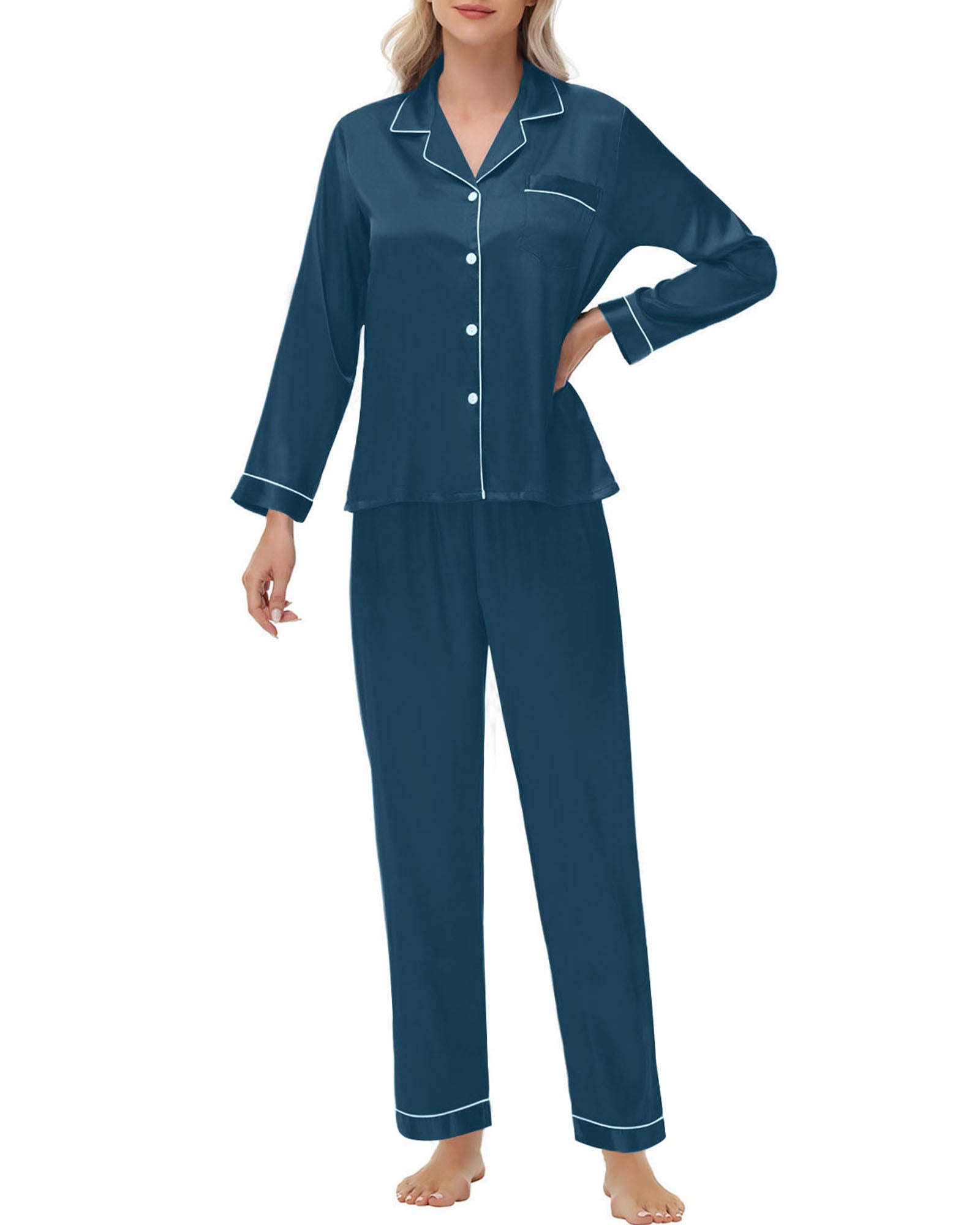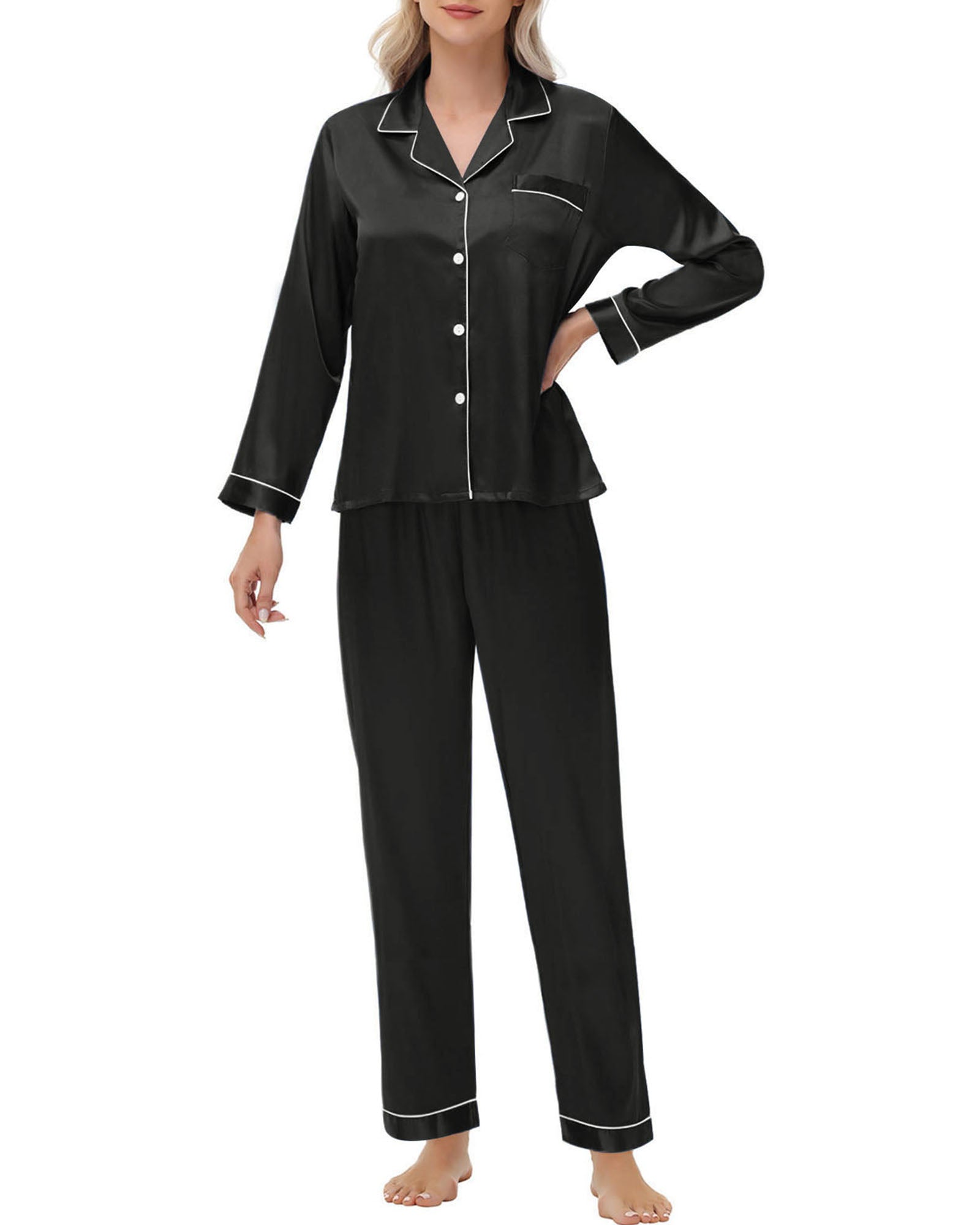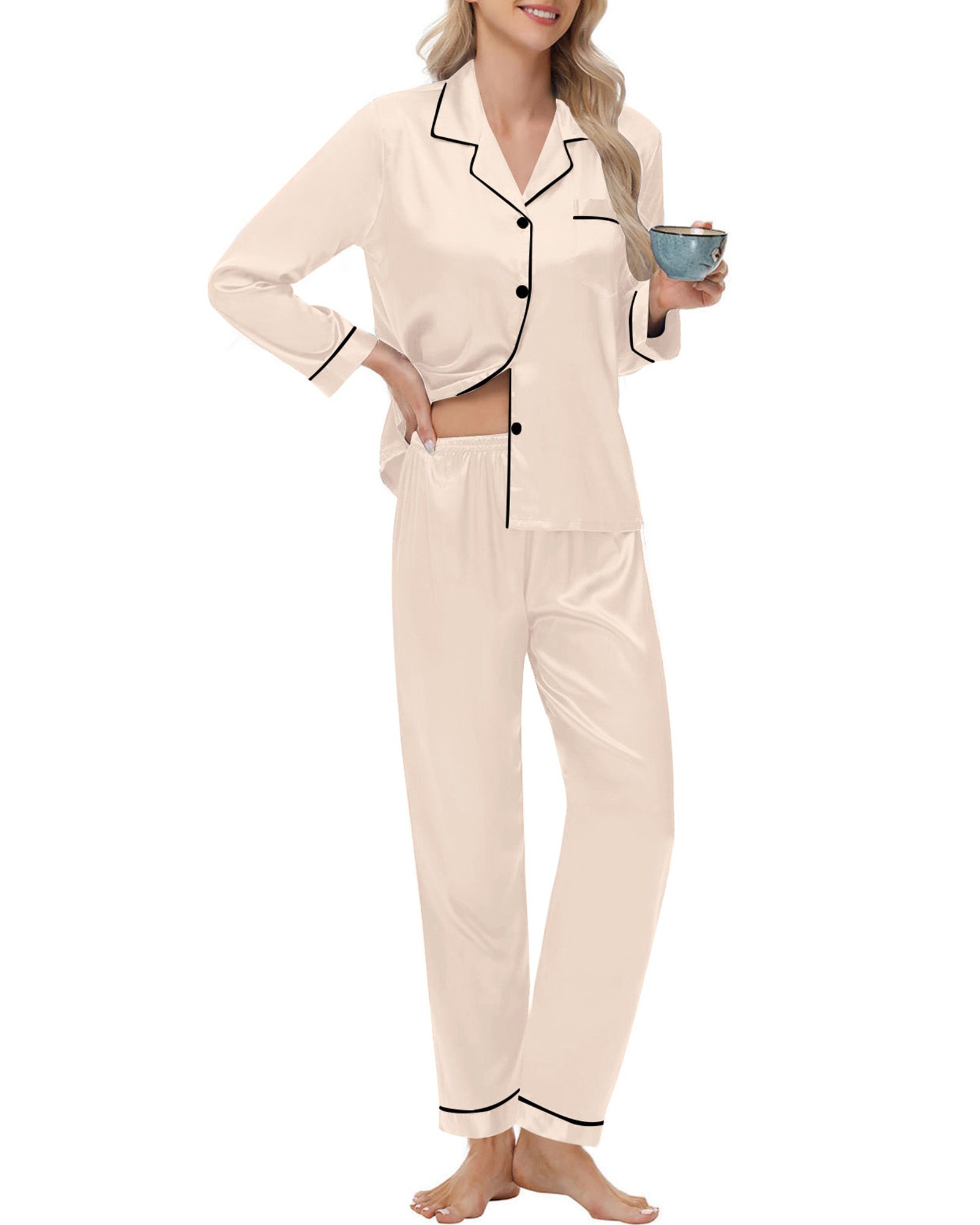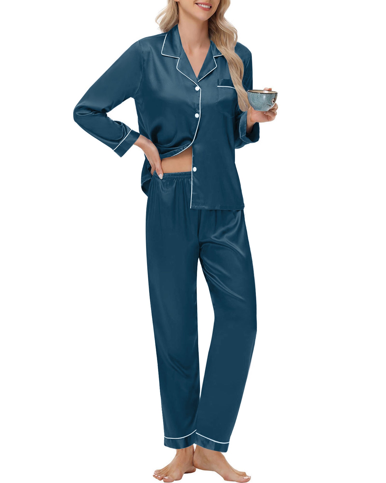 👚【Features】The women pjs top uses classic notch collar, button front, v neck, length at hips, contrast piping. Blouse goes well with jeans short, skirt, bag, earrings, sandals as womens outfits for casual daily look. Satin pj is featured with relaxed fit wide legs long pants, elastic waist, easy to adjust the tightness and fit for any body size, which give you the maximum comfort.