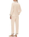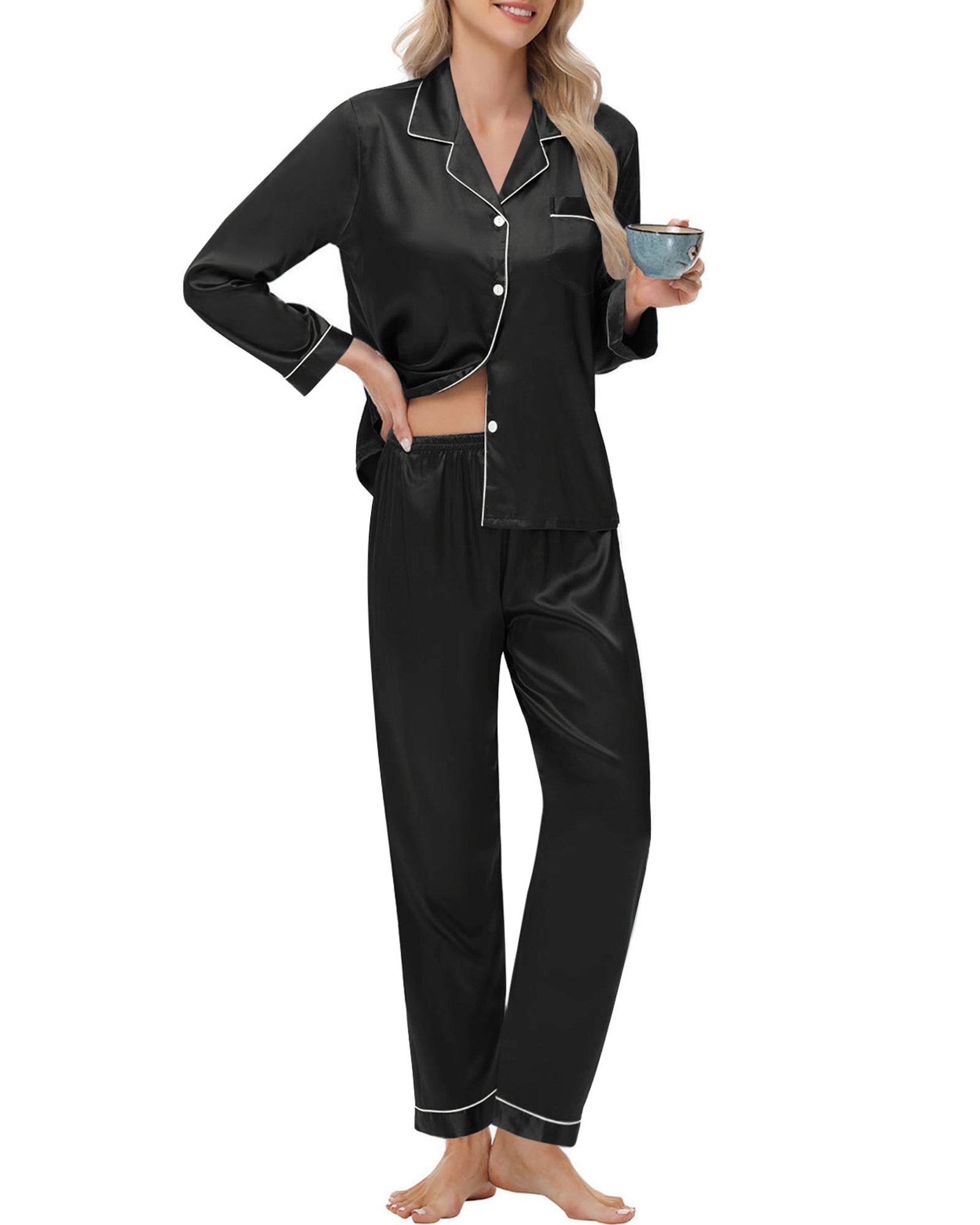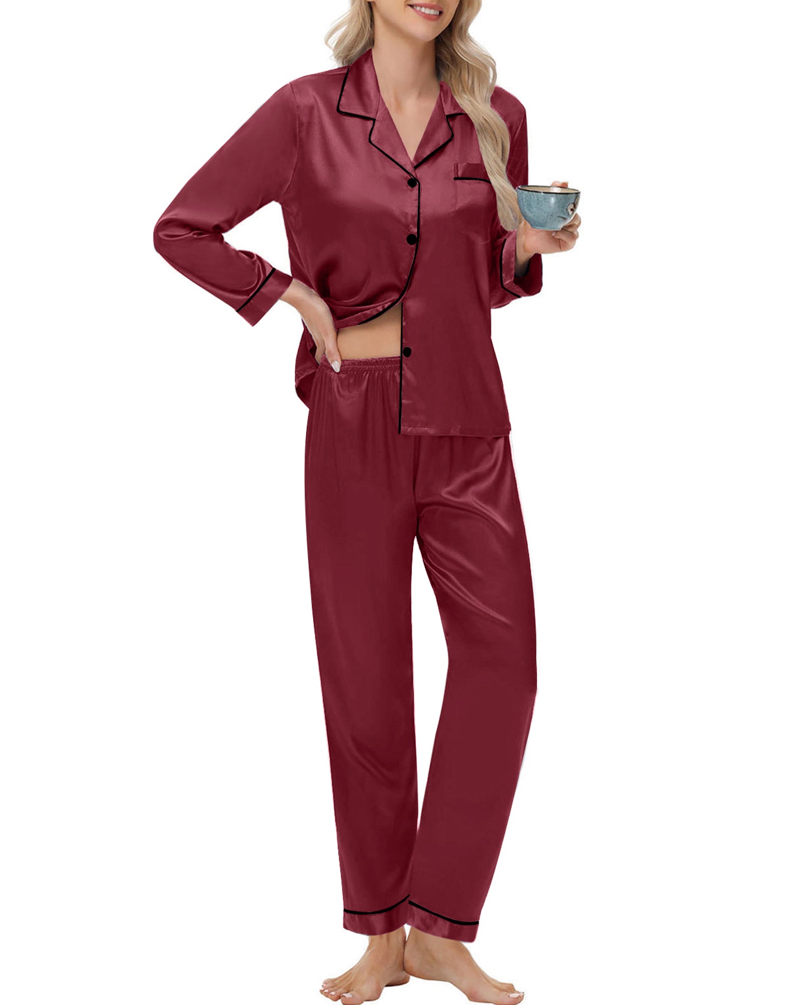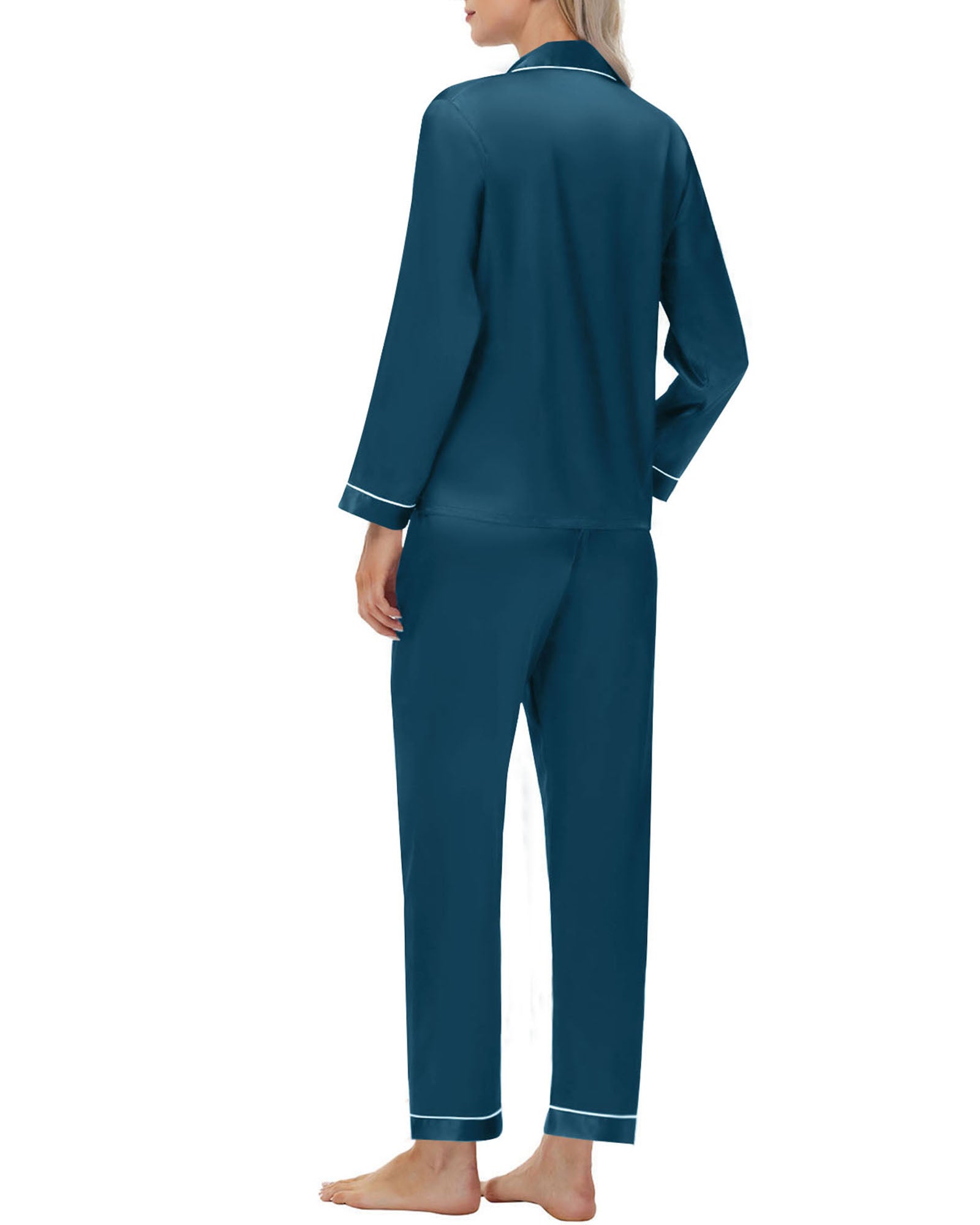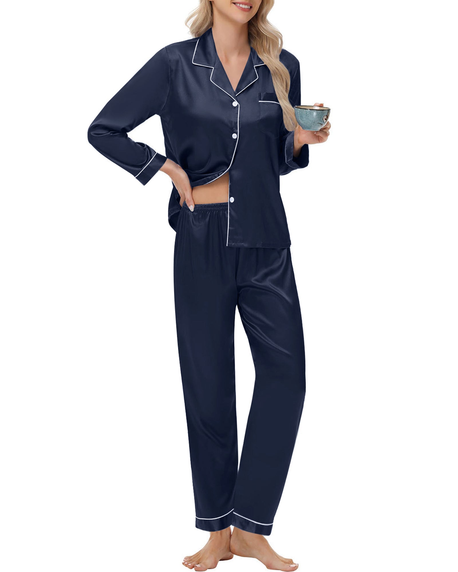 👚【Features】The women pjs top uses classic notch collar, button front, v neck, length at hips, contrast piping. Blouse goes well with jeans short, skirt, bag, earrings, sandals as womens outfits for casual daily look. Satin pj is featured with relaxed fit wide legs long pants, elastic waist, easy to adjust the tightness and fit for any body size, which give you the maximum comfort.