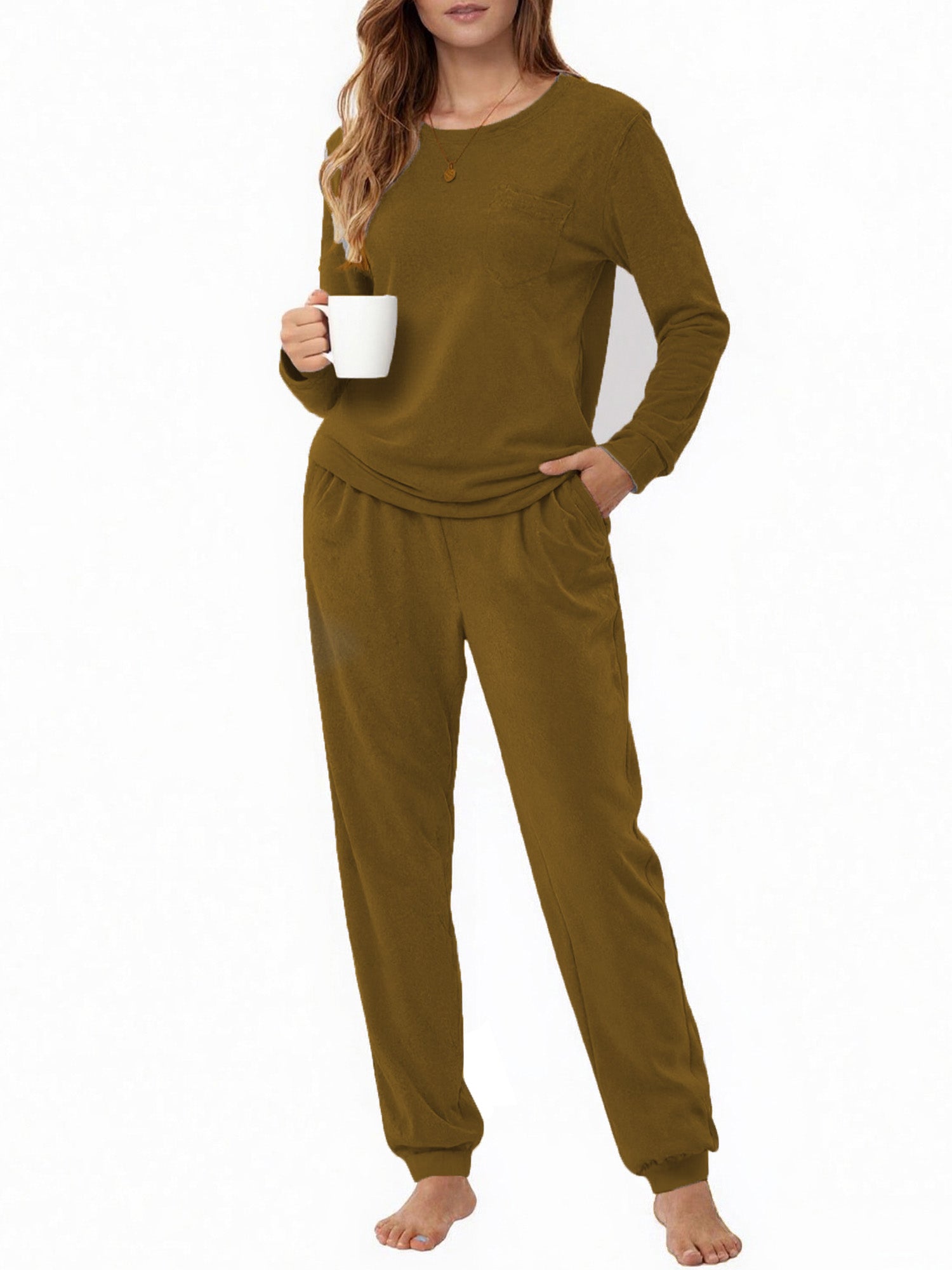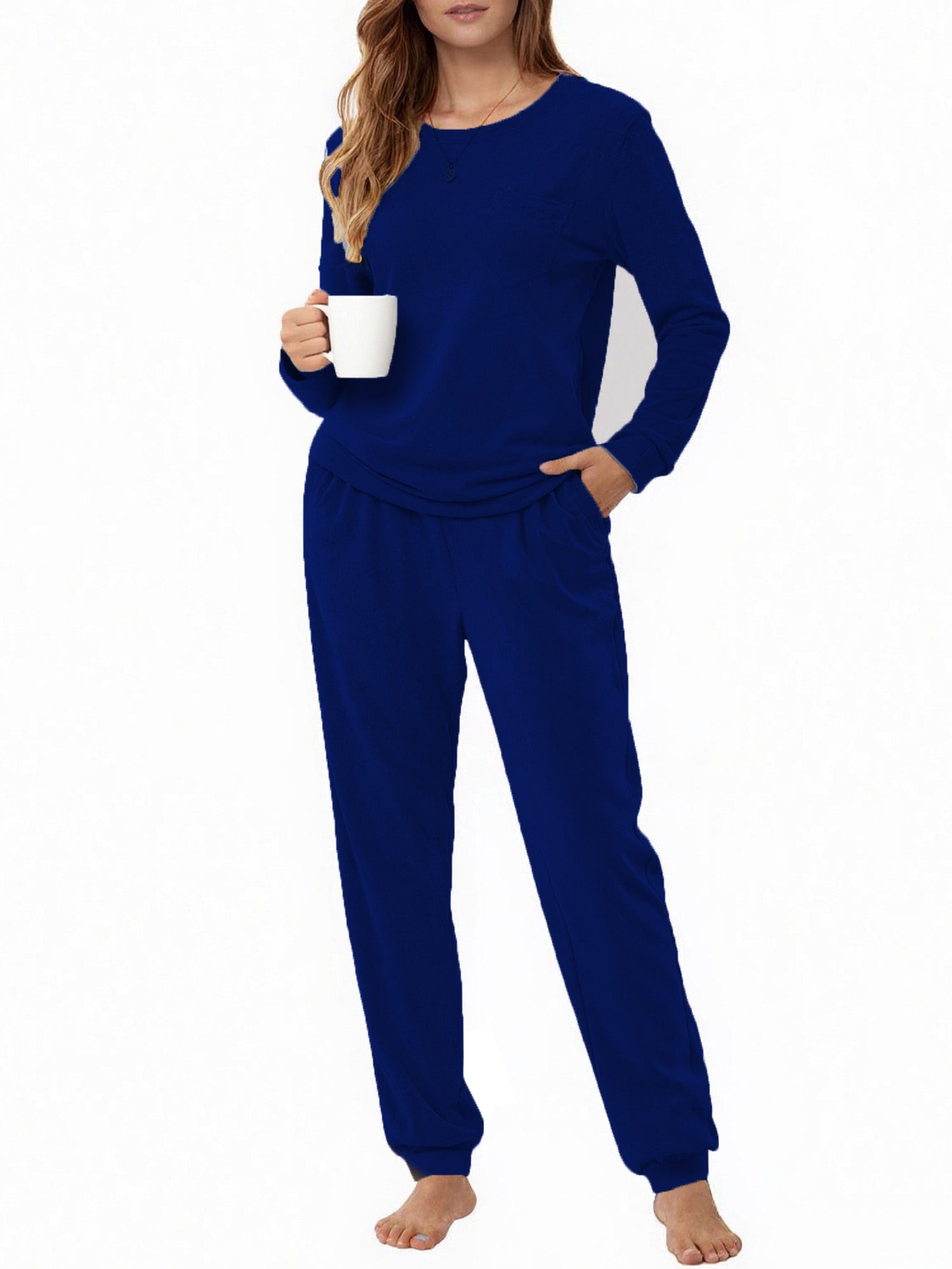 Enjoy ultimate comfort and functionality with this women’s pajama set, designed for both sleep and lounging. The top features a classic crew neckline and long sleeves, offering full coverage and a relaxed fit that moves with you. The matching full-length pants are crafted with an elastic waistband for a snug yet flexible feel, and the hems are designed with closed cuffs, ensuring warmth while providing comfort. A practical addition—two side pockets—adds everyday convenience, perfect for holding small essentials like tissues, lip balm, or your phone. Made from soft, breathable fabric that feels smooth against the skin, this set makes bedtime and downtime equally cozy.